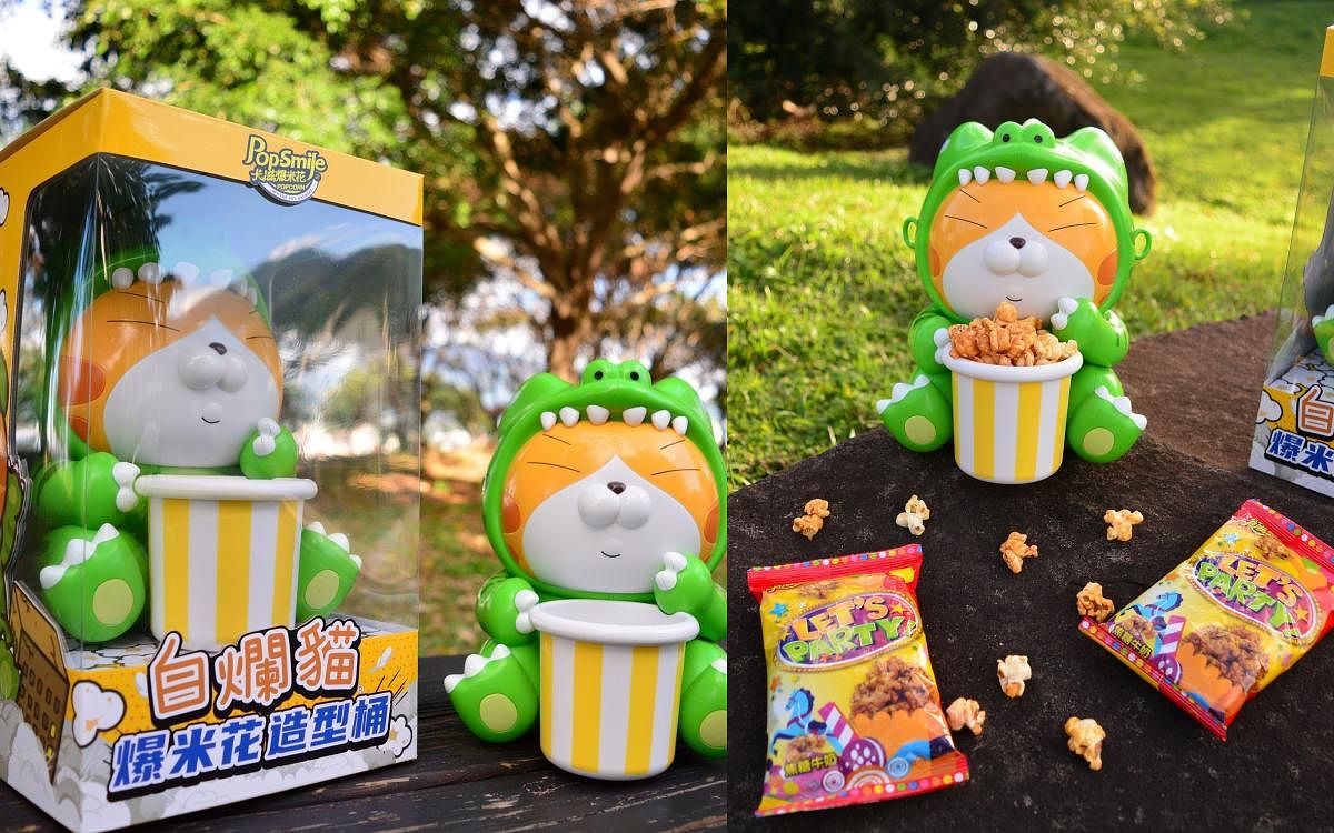 「卡滋爆米花」與台灣知名原創IP白爛貓合作,以「 恐龍爛變裝系列」為設計推出「卡滋x白爛貓爆米花造型桶」。口味結合卡滋爆米花的經典招牌美味-美式焦糖牛奶爆米花,綿密香濃焦糖搭上清香酥脆的爆米花,打造出怪獸般的究級美味,多功能造型桶裝設計,不僅造型可愛具有收藏價值!