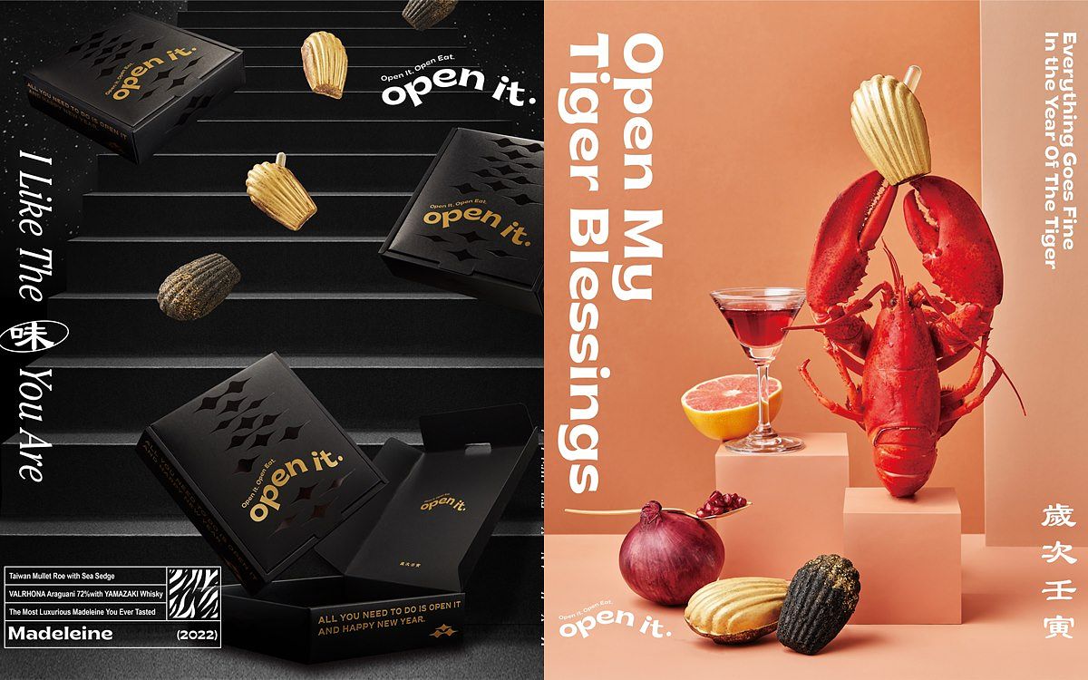 作為品牌首次創作的年節禮盒,open it 團隊傾力製作且致力於創新,屬於2022虎年限定的極奢華黑金主題瑪德蓮浮誇誕生。從禮盒包裝到瑪德蓮的設計製作,都以華麗富貴的黑金為主軸,沈穩覇氣有份量,不僅要給你視覺的奢華饗宴,更要給你味覺的甜鹹新體驗。