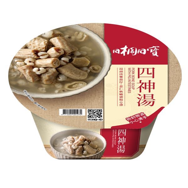 台北名店「阿桐阿寶四神湯」聯名開發。豬骨湯頭加入在地豬腸與飽滿薏仁原盅烹煮,並添加少許米酒提味,湯頭淡雅溫厚