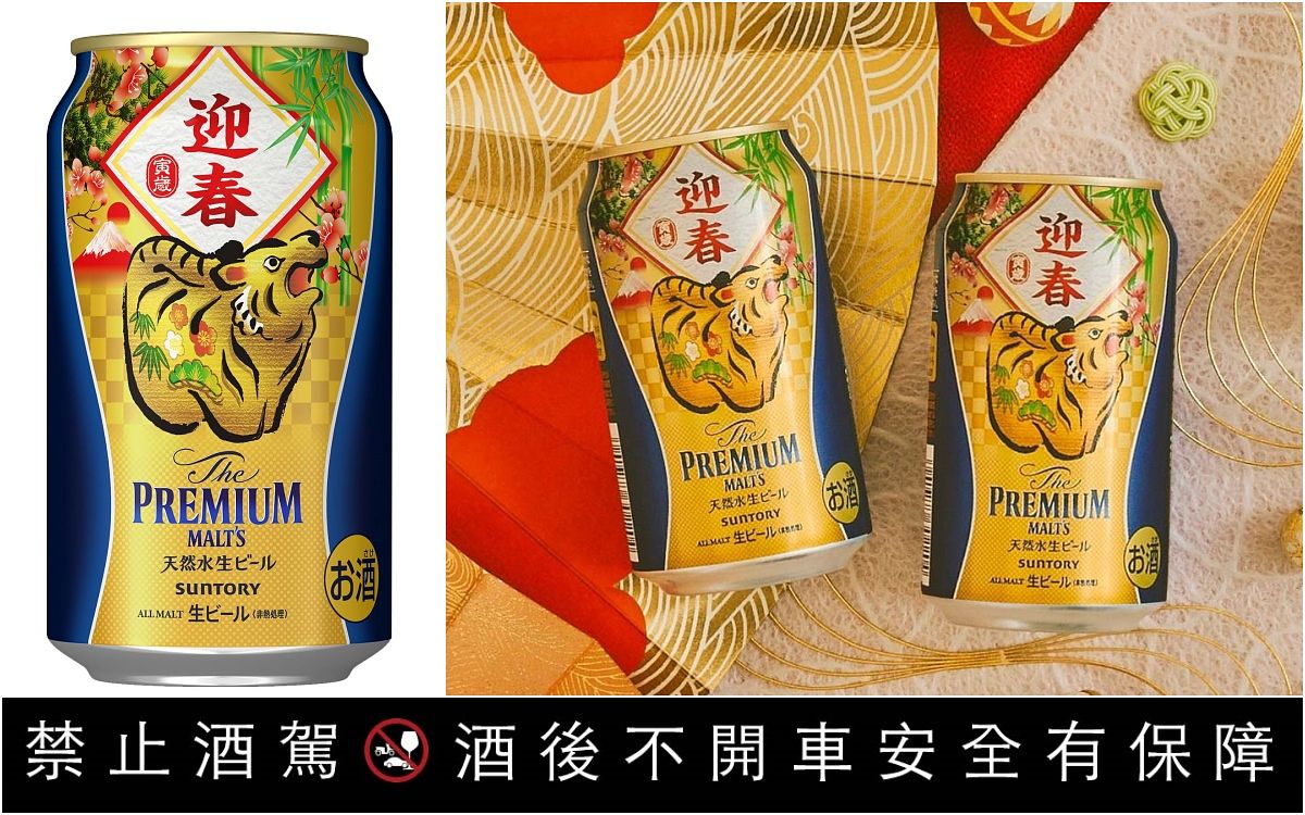 日本「三得利頂級啤酒The PREMIUM MALT’S」每年都會於過年特別推出期間限定的生肖款包裝,今年的金虎年,特別推出金光熠熠的「迎春虎年好運款」包裝設計,金色瓶身代表財源滾滾,寅虎圖案的日式風鈴代表去除厄運,「迎春」二字周圍更有冬日長青之意的「松、竹、梅」,以及象徵平安和財富的紅色富士山,完美融合台灣及日本的新年元素。