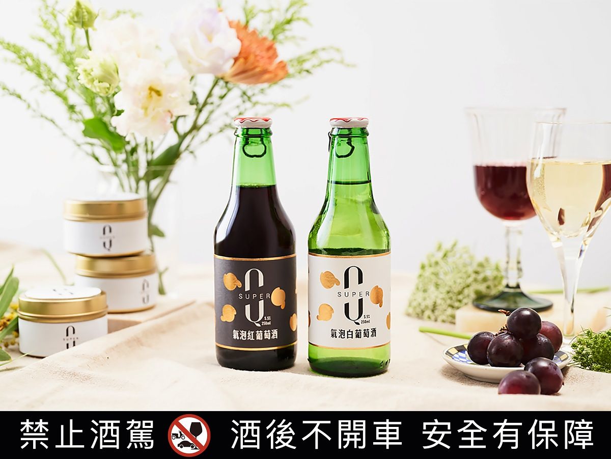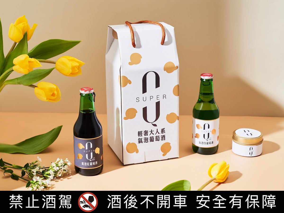 台灣限定白金香氛微醺禮盒組,內含兩款SUPER Q紅白氣泡葡萄酒,融合大人葡萄酒的高質感和香檳氣泡飲的清爽口感,交疊相容的微醺風味。白色瓶身包裝搭配金色點綴的氣泡白葡萄酒,酒體閃爍萊姆黃的色澤,淡淡的清香味揉合了清爽的香檳口感,另一款氣泡紅葡萄酒,帶有燉李子和香草的味道,紅寶石般的酒體散發飽滿圓潤的果香。