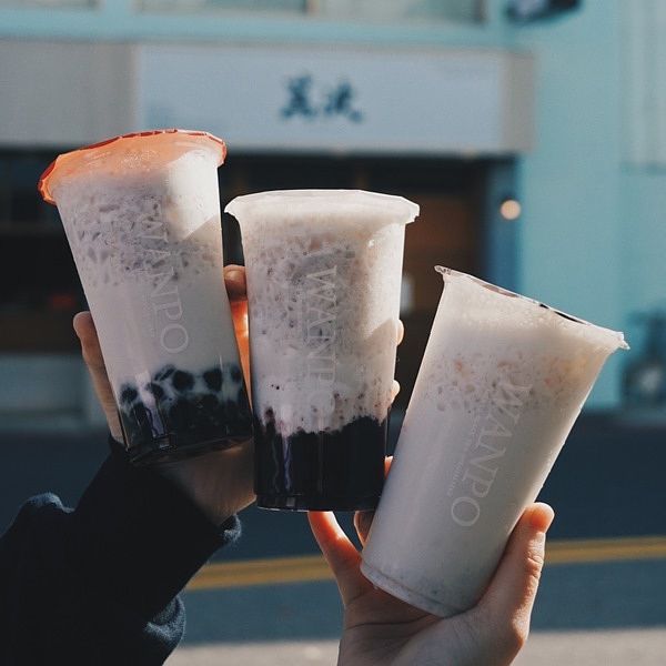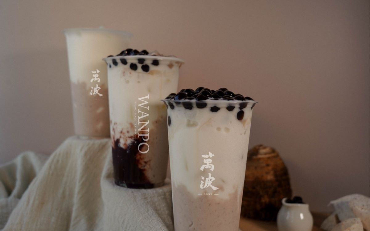 「紫米芋芋椰奶」是以南洋甜點摩摩喳喳為概念延伸所設計出來的飲品,將檳榔心芋頭攪拌成鬆軟的芋泥再加上鮮奶,並加入南洋甜點中必備的椰漿,充滿芋頭和椰漿交織而成的獨特香氣;除此之外,「紫米芋芋椰奶」中放入了軟糯的紫米和小芋圓,以及台灣人最愛的波霸,整杯配料裝好裝滿,將南洋風味結合香Q口感,讓人一口接一口,飽足感十足,推出之後就受到消費者的熱烈歡迎,也成為了萬波的招牌飲品之一。
