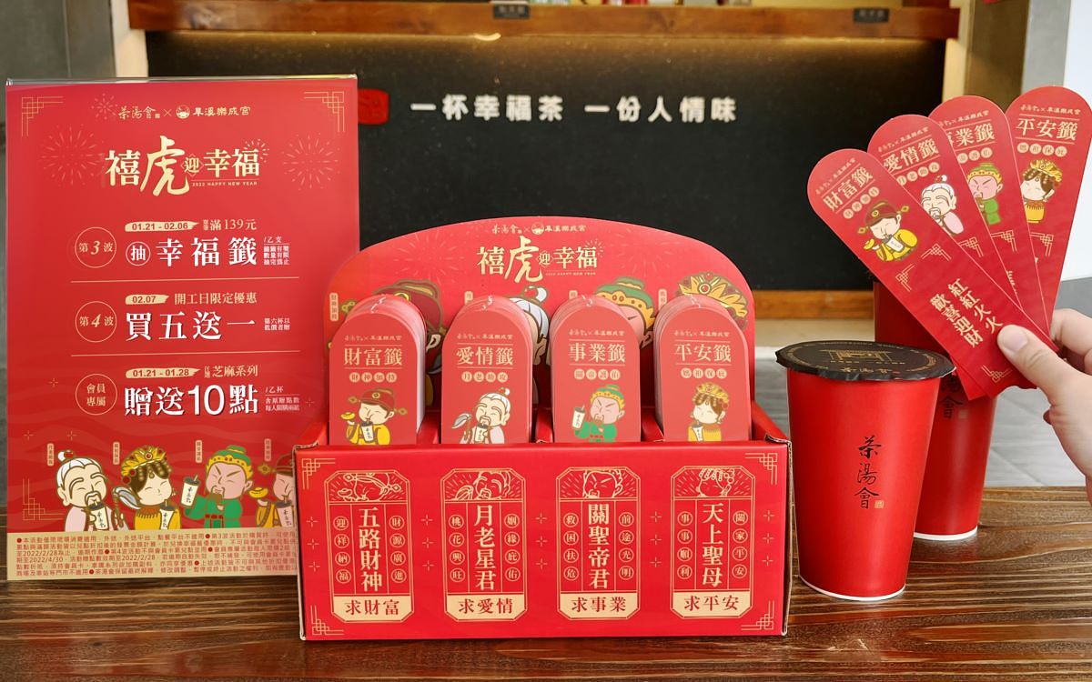 茶湯會表示:「今年有幸能與在地百年古蹟廟宇─【台中旱溪樂成宮】攜手聯名,將經典茶飲與傳統廟宇文化結合,以鐵觀音茶類象徵庇護平安、排行榜茶類象徵升官加薪榜上有名、調味茶類象徵愛情的酸甜滋味、紅茶類象徵財富興旺,氣勢長虹,繪製設計四位 Q 版神明「媽祖、關帝、月老、財神」,提供茶友保平安、祈事業、許愛情、求財運的幸福籤,張張籤詩都由樂成宮過香爐加持。從 1/21 起至 2/6 止,只要到茶湯會街邊門市單筆消費滿 139 元,即可抽乙張籤詩,每款幸福籤除了有讓人會心一笑的趣味詩句,同時也是多款優惠的兌換券;期盼茶友能飲好茶、求好運。