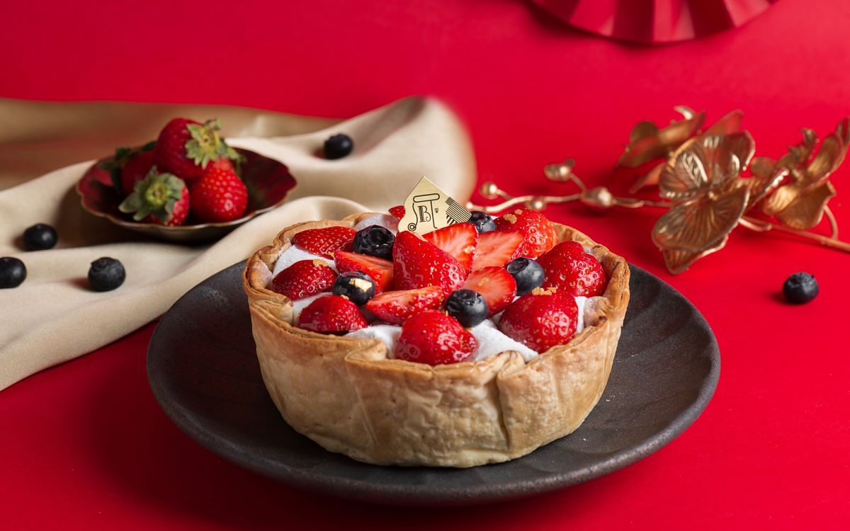受日本傳統新年吃麻糬代表感謝豐收的習俗啟發,以日本具福氣吉祥寓意的大福為設計靈感,將PABLO經典原味起司塔擠上帶顆粒的紅豆鮮奶油,並鋪上軟Q的麻糬雪莓娘皮,再放上多汁的草莓及藍莓,最後以金色雪花餅乾碎片點綴出新年氛圍。醇濃的起司讓香甜綿密的紅豆吃起來更加柔滑,高雅的莓果酸甜除卻膩口感,軟Q的麻糬皮則帶來嚼感,營造出兼具美味及節慶喜氣的滿滿幸福味!