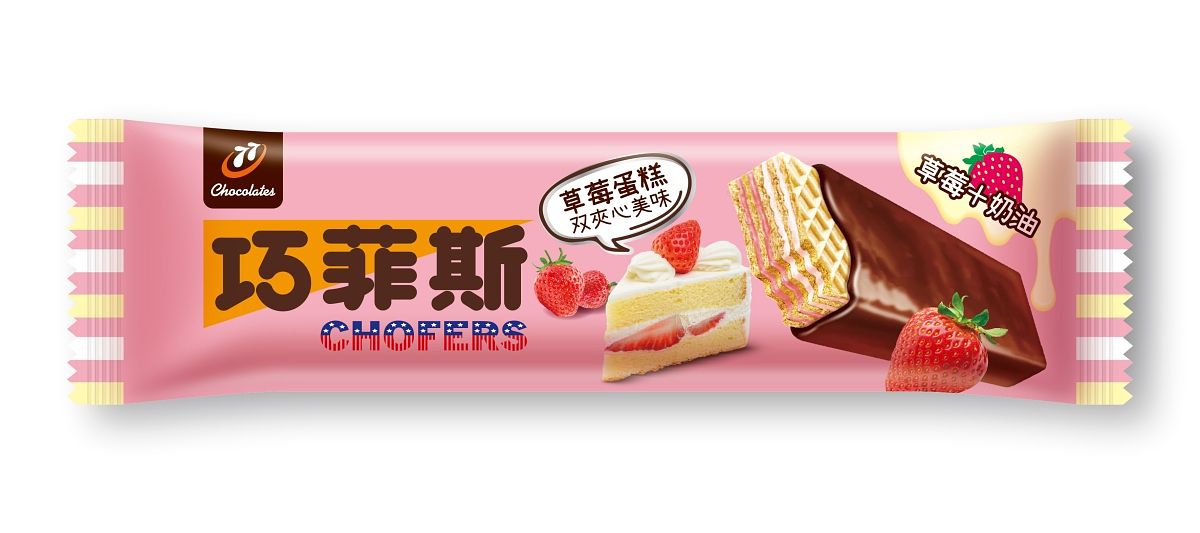 從小吃到大的小點心新推出了草莓蛋糕口味,外層是牛奶可可,搭配綜合莓果融合濃郁卡士達,酥脆威化餅乾呈現多層次風味。