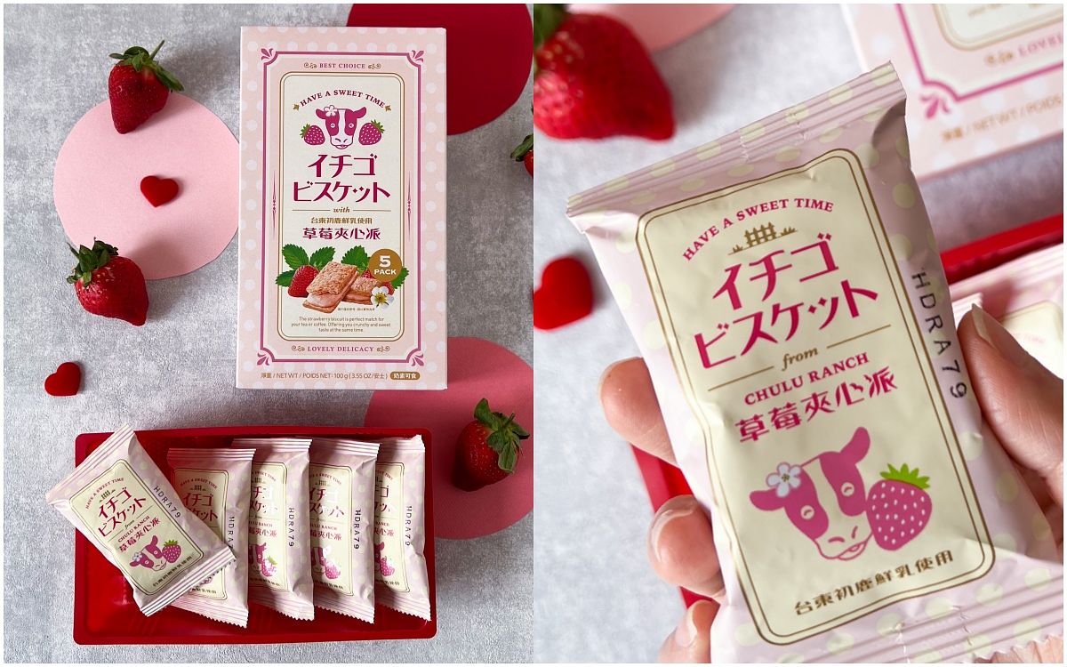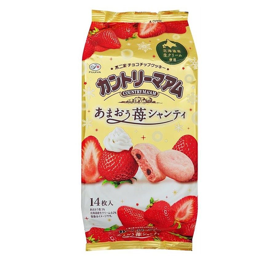 不二家暢銷鄉村風烘焙餅乾系列,採用福岡甘王草莓及北海道鮮奶油製成,酸甜草莓及巧克力豆入餡,好吃不膩。