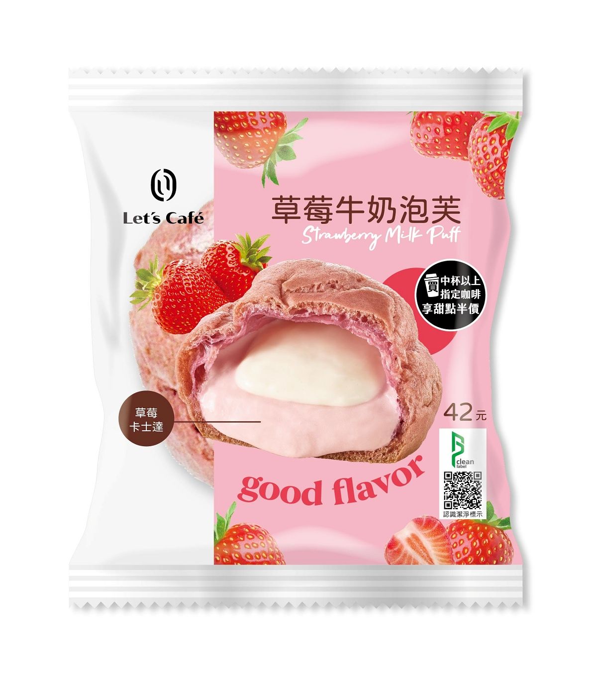 外層為討喜的粉紅色泡芙皮,內餡是以鮮乳坊鮮乳與草莓醬特製而成的卡士達,由裡到外都是粉紅色的的爆餡幸福系泡芙。
