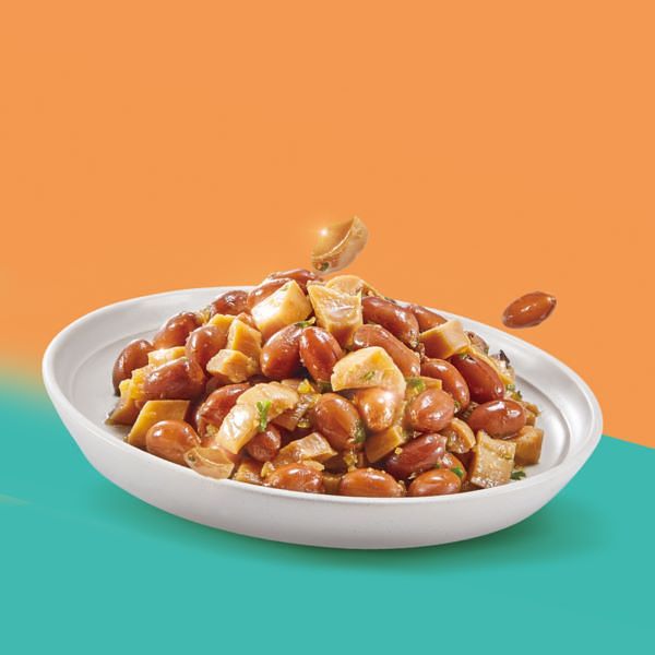 嚴選雲林在地特選大顆花生,搭配Q彈多汁的杏鮑菇,由甘草、八角、蔥、薑、蒜等熬煮出的獨門滷汁,悶浸至杏鮑菇花生裡,再澆淋爆香過的蔥蒜油,入口剎那蔥蒜香氣撲鼻而來,隨之感受堆疊花生及Q彈杏鮑菇獨特、多層次的超涮嘴口感,讓人停不下來!