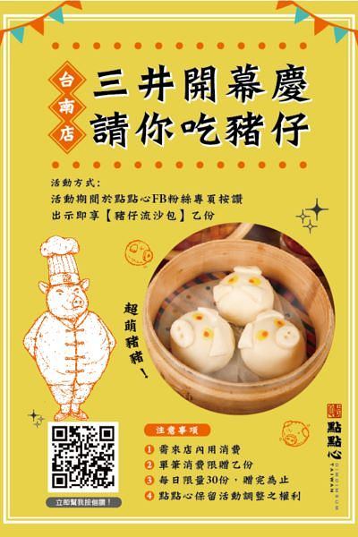 人氣港點『點點心』10號店登陸台南三井!開幕期間贈送招牌「豬仔流沙包」!
