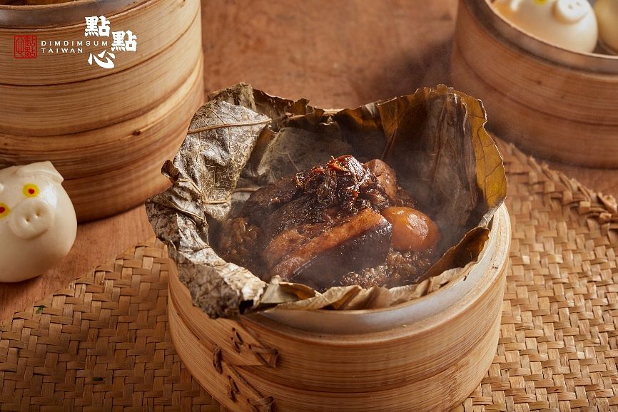 點點心特製荷葉梅干扣肉糯米飯,特選的香Q糯米與恰好鹹香的梅干菜,以荷香包裹入蒸籠,超重量級內餡有三層肉、鹹蛋黃、芋頭塊,荷葉一開香味四溢,每一口都聞得到初夏的荷葉香氣,口口驚奇飽足。