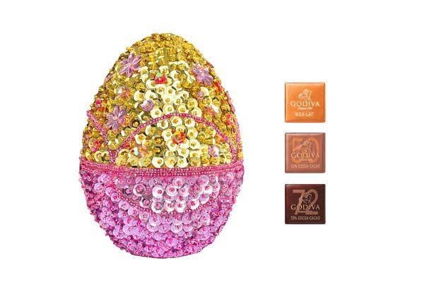 以粉色為主色調妝點的復活蛋形包裝,手工繡上的花瓣形狀與璀璨珠片讓人目不轉睛!內含GODIVA經典片裝牛奶巧克力、片裝50%黑巧克力與片裝72%黑巧克力,可可的馥郁香氣縈繞,在唇齒間綻放出最迷人的滋味。