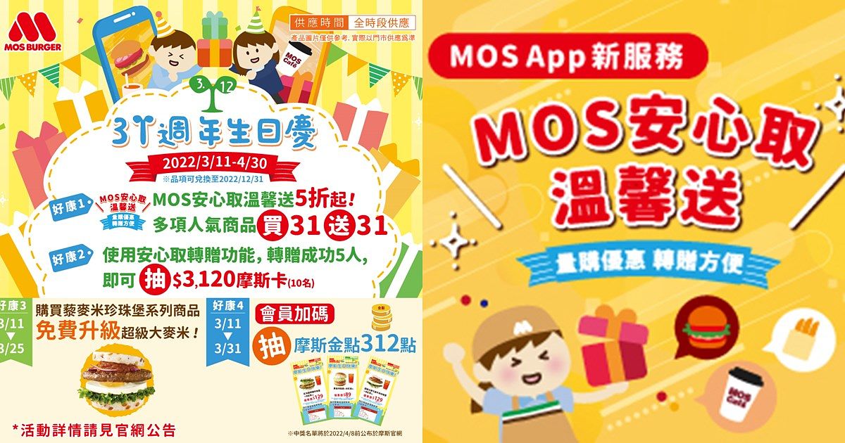 「MOS安心取溫馨送」主打優惠買、慢慢用、溫馨送、方便取,優惠買:摩斯漢堡的會員可以在安心取專區,享用眾多活動最低5折優惠!量購優惠的內容包括MOS Cafe’、紅茶、漢堡、點心及各項適合送禮的商品,312生日慶活動期間3/11至4/30在安心取購買摩斯咖啡及經典的摩斯紅茶,就可以享受買31送31杯及買50杯送50杯、買百杯送百杯的半價優惠,還有各式摩斯蒟蒻、咖哩等禮品。慢慢用:以優惠價格購買,依商品性質而有不同的取貨期限。溫馨送:各種場合任何時機,透過手機Line可以方便且大方地轉贈碼寄送給身旁或遠方的家人、親友、同事、情侶、任何Line得到的對象。方便取:只要加入會員,任何人都可以使用Line收到的轉贈碼取得優惠票券,到全台直營摩斯漢堡取貨享用。