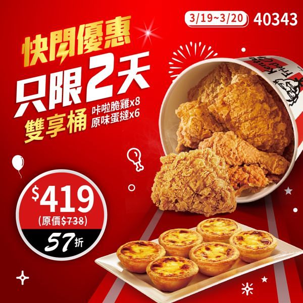 肯德基為了讓粉絲們盡情享受週末假期,於2022年3月19日(六)至3月20日(日)推出「雙享桶」限定價$419快閃優惠,原價$738的8塊雞桶餐(咔啦脆雞x8)及6顆原味蛋撻,直接下殺57折,超激省$319!只要期間內於全台肯德基門市出示優惠畫面、或結帳時與服務人員報出優惠代碼「40343」,就可以一次享有狂嗑肯德基暢銷商品,僅僅二日快閃限定,不容錯過!無論是多人歡聚時刻,或者炸雞控、蛋撻控個人獨享時光,肯德基就要讓大家在週末一起盡情啃啃肯德基!