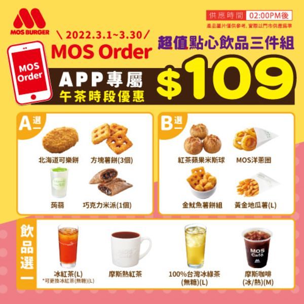 即日起到摩斯漢堡點購漢堡加125元即可享用飲品+黃金地瓜薯(L)+蒟蒻(1杯)的套餐組合,此外4/30前也推出午茶點心超值選,包含三件組A區加B區加指定飲品優惠價109元,以及兩件組A區加指定飲品69元。點心A區有北海道可樂餅、抹茶紅豆米派等,點心B區有黃金地瓜薯、紅茶蘋果米斯球等,指定飲品則有大杯冰紅茶、摩斯咖啡等。快來摩斯漢堡享用點心飲品,度過愉快的午茶時光。想要在家吃零食,還有MOS Burger 摩斯漢堡官方網路商城的黃金夯吉片可以選擇。