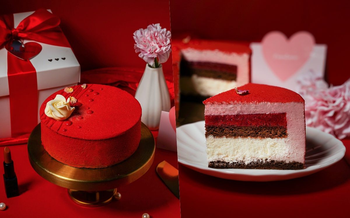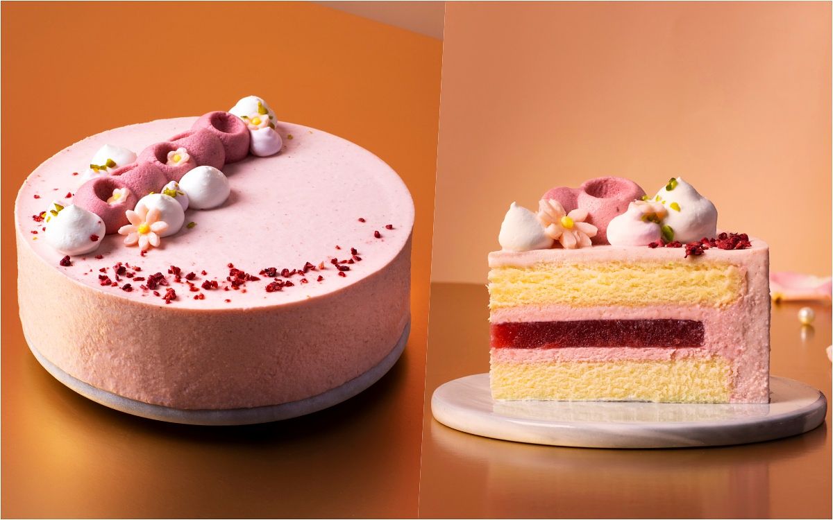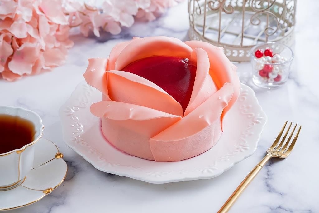 「玫瑰馨情」,主廚將原味及莓果慕斯夾入軟綿的戚風蛋糕裡,搭配特製的野莓果凍與新鮮草莓更增驚豔口感,此款蛋糕開放低溫宅配到府服務。