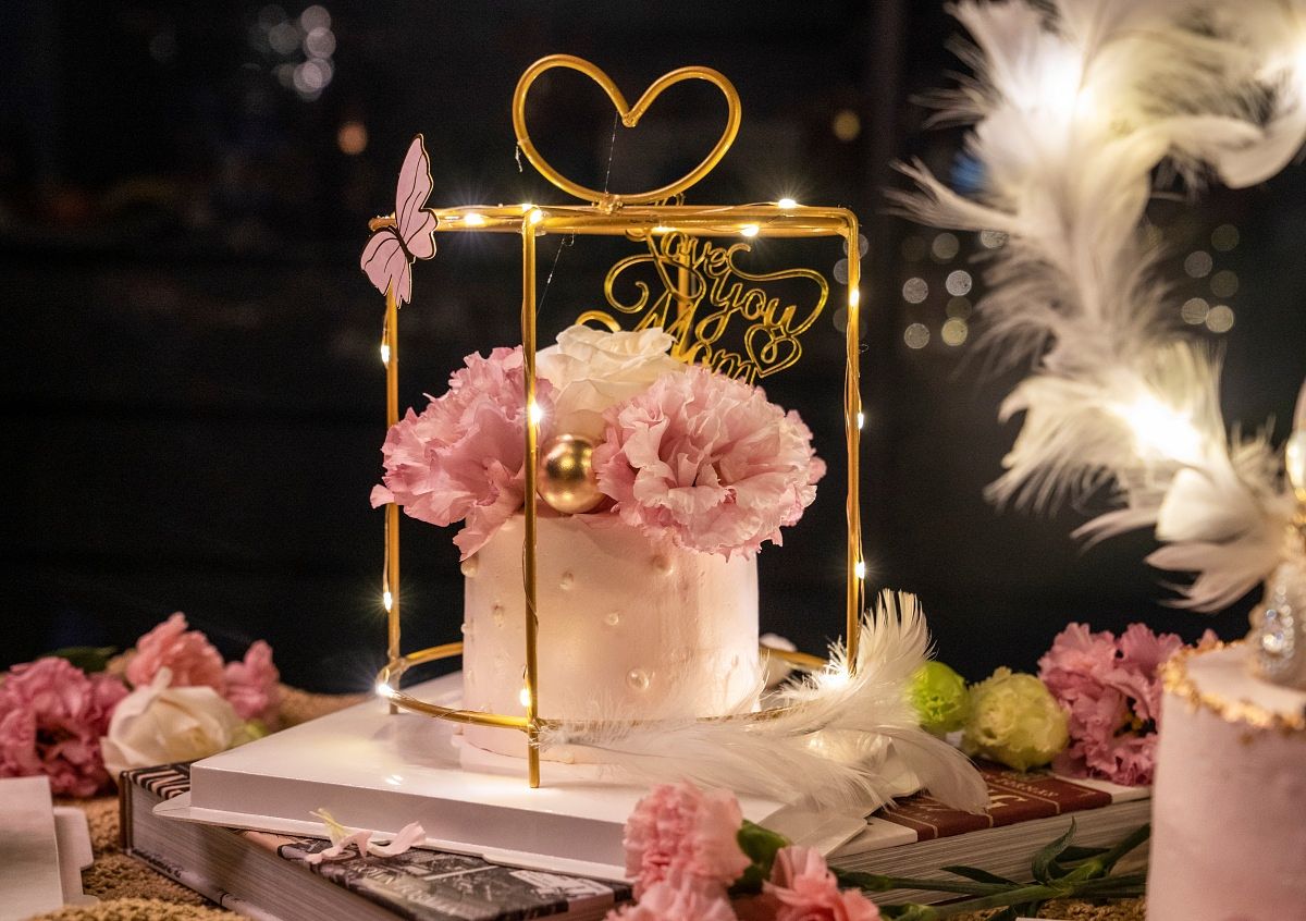 充滿仙氣粉紅蛋糕,內餡是覆盆子與草莓泥,與韓式豆沙裱花再加上綿密順口的法國愛樂薇鮮奶油與膠原蛋白,搭配著星光熠熠的燈飾,打造一場美味與視覺的饗宴!