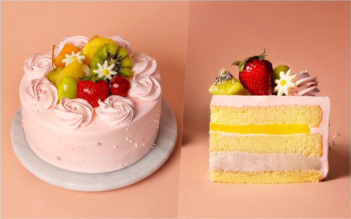 當季綜合繽紛水果,搭上浪漫優雅的粉色戚風蛋糕與花朵鮮奶油,使用愛樂薇鮮奶油夾餡可自選水蜜桃、芋頭口味或是香甜可口的布丁。