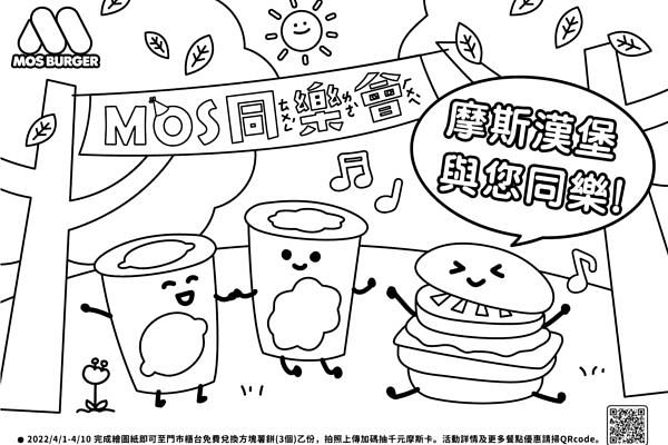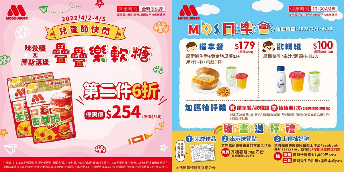 歡慶兒童節,讓爸媽家長及小朋友天天都開心!摩斯漢堡於4/1至4/10期間推出MOS同樂會活動。活動期間推出2組優惠餐,「獨享餐」:摩斯鱈魚堡、搭配黃金地瓜薯(L)、摩斯蘋果汁或摩斯柑橘綜合果汁及蒟蒻,原價200元,優惠價179元以及「歡暢組」:摩斯鮮乳、摩斯蘋果汁、摩斯柑橘綜合果汁、蒟蒻任選3入原價105-120元,優惠價100元,凡臨櫃購買上述優惠餐即加碼享抽抽樂一次,有機會獲得免費大杯冰紅茶1杯、方塊薯餅1份、禮袋1個、或同樂會貼紙1份等獎項。另外也推出繪畫活動:首先向店舖索取「同樂會繪圖紙」,再將完成後的繪圖紙出示給門市人員,即可免費兌換方塊薯餅1份,最後將完成的繪圖紙拍照上傳Facebook或Instagram,即可參與抽獎,有機會獲得千元摩斯卡,連假期間邀請親子來MOS同樂及享用美味。