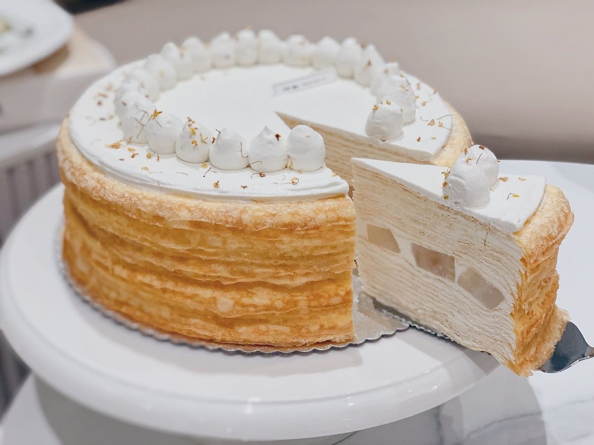 千層蛋糕名店「時飴」在今年母親節推出的是優雅系的「桂花釀洋梨千層蛋糕」。仿效在歐洲深受喜愛的西洋梨甜點,將它與台灣桂花蜜結合,打造出桂花釀香氣馥郁,洋梨清爽多汁的千層蛋糕口味。花香與果香交織於口中,吃起來清新不膩。