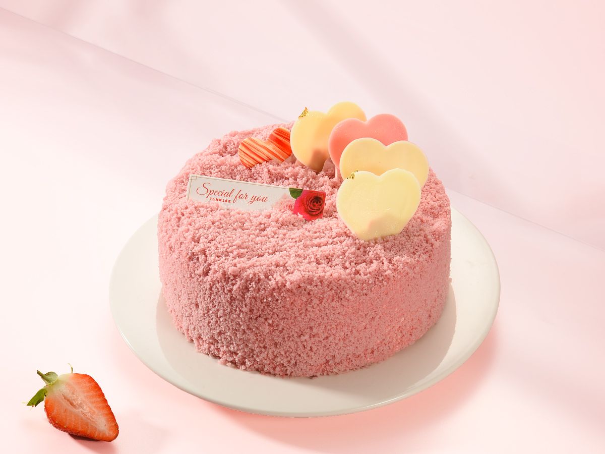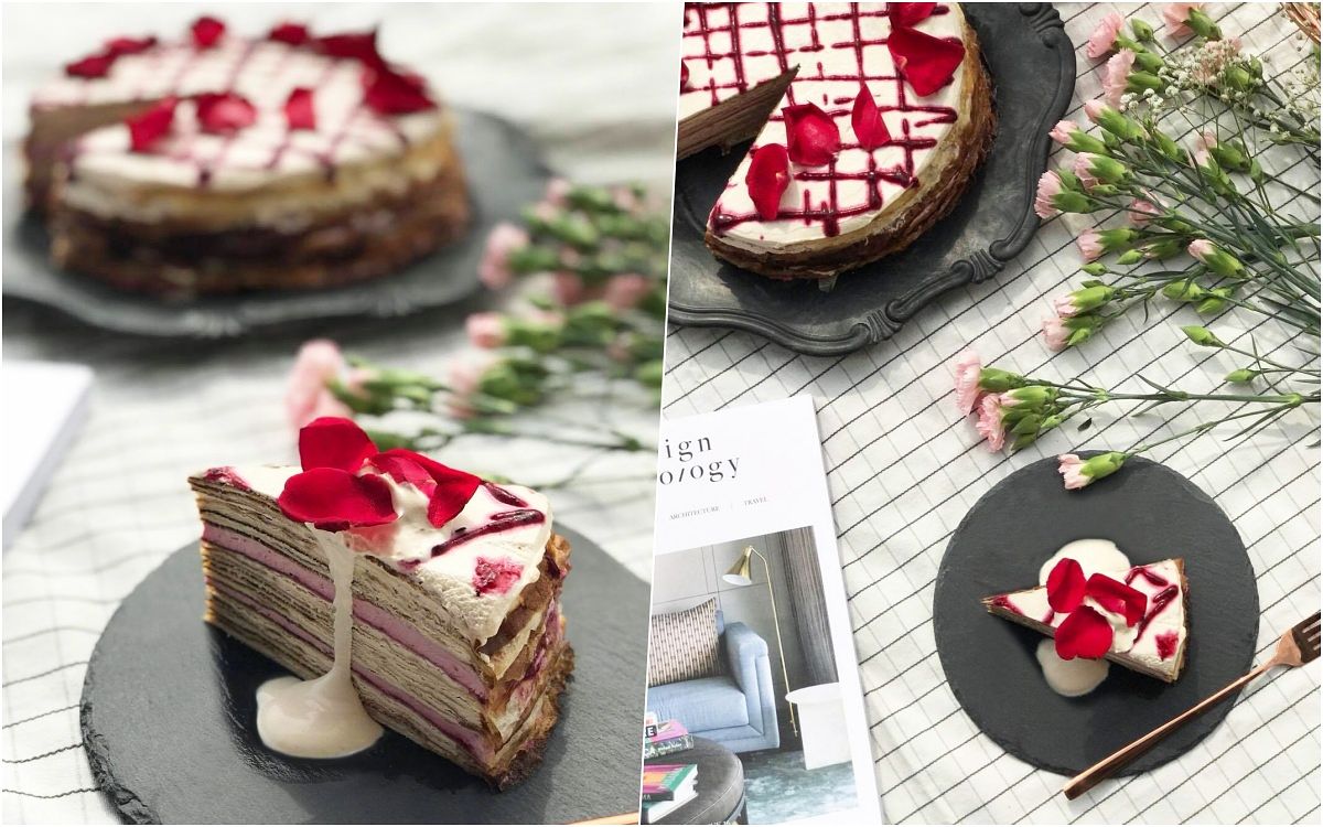 用淡雅爽口的玫瑰覆盆子千層蛋糕,以清爽花香、果香作為亮點,將濃郁玫瑰與覆盆子抹醬融入層層濕潤千層餅皮中,並於頂層畫上由覆盆子醬浪漫交織出的優雅線條、撒上屏東嚴選食用玫瑰花瓣,為蛋糕的口感、外型帶來濃厚浪漫氛圍,每一口都能品嚐到細膩清爽口感與淡淡花香在嘴中化開。