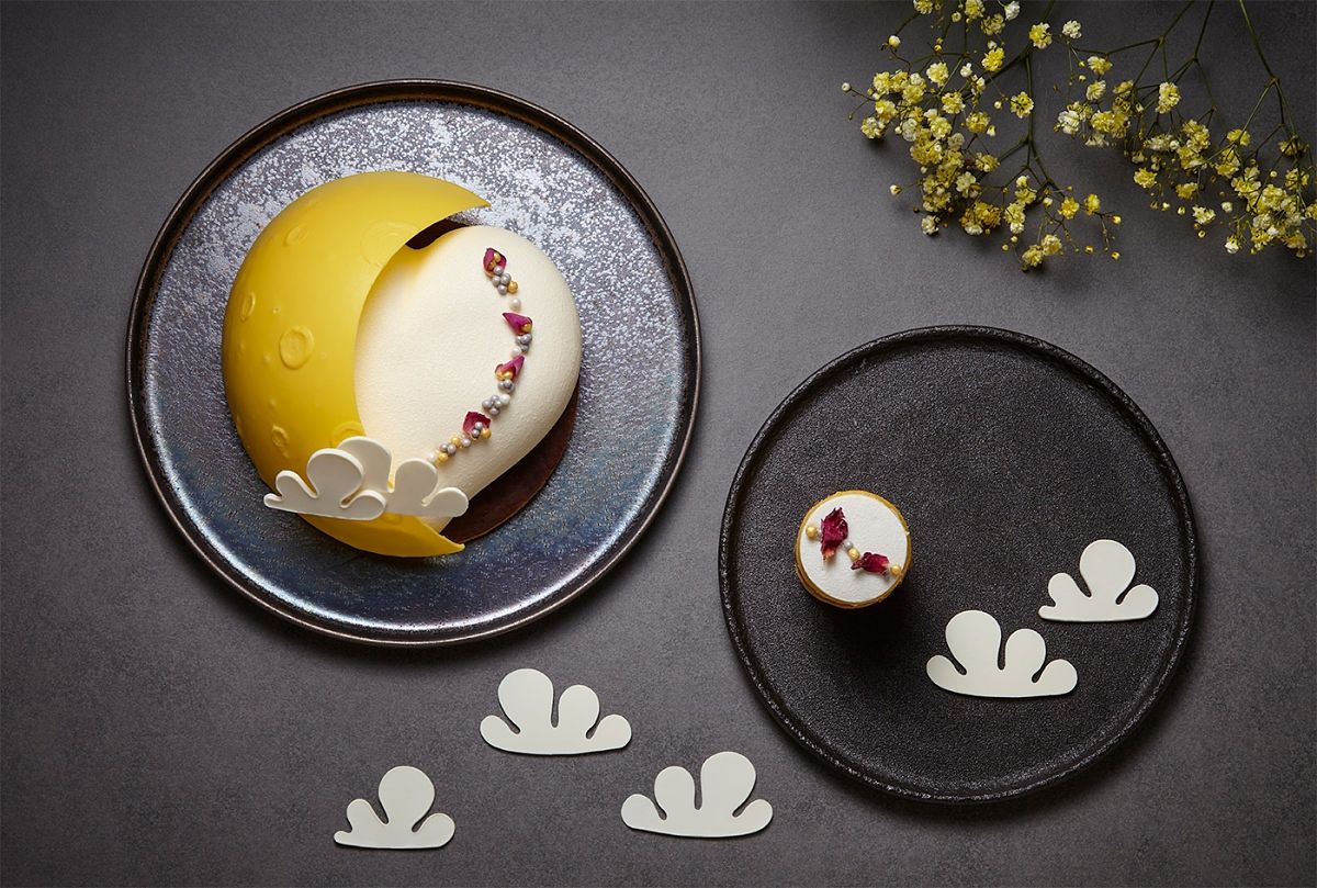 eslite hotel The Lounge大廳書坊推出「月映蓮心」母親節限定蛋糕,以「掩月」概念創作出球狀弧面的下弦月,下方隱約透出純白的立體愛心。蛋糕主體為口味清爽且無負擔的紅茶南瓜慕斯,堆疊白蘭地焦糖蘋果、胡核桃果碎與鷹嘴豆泥,創造出層次豐富的味蕾感受。