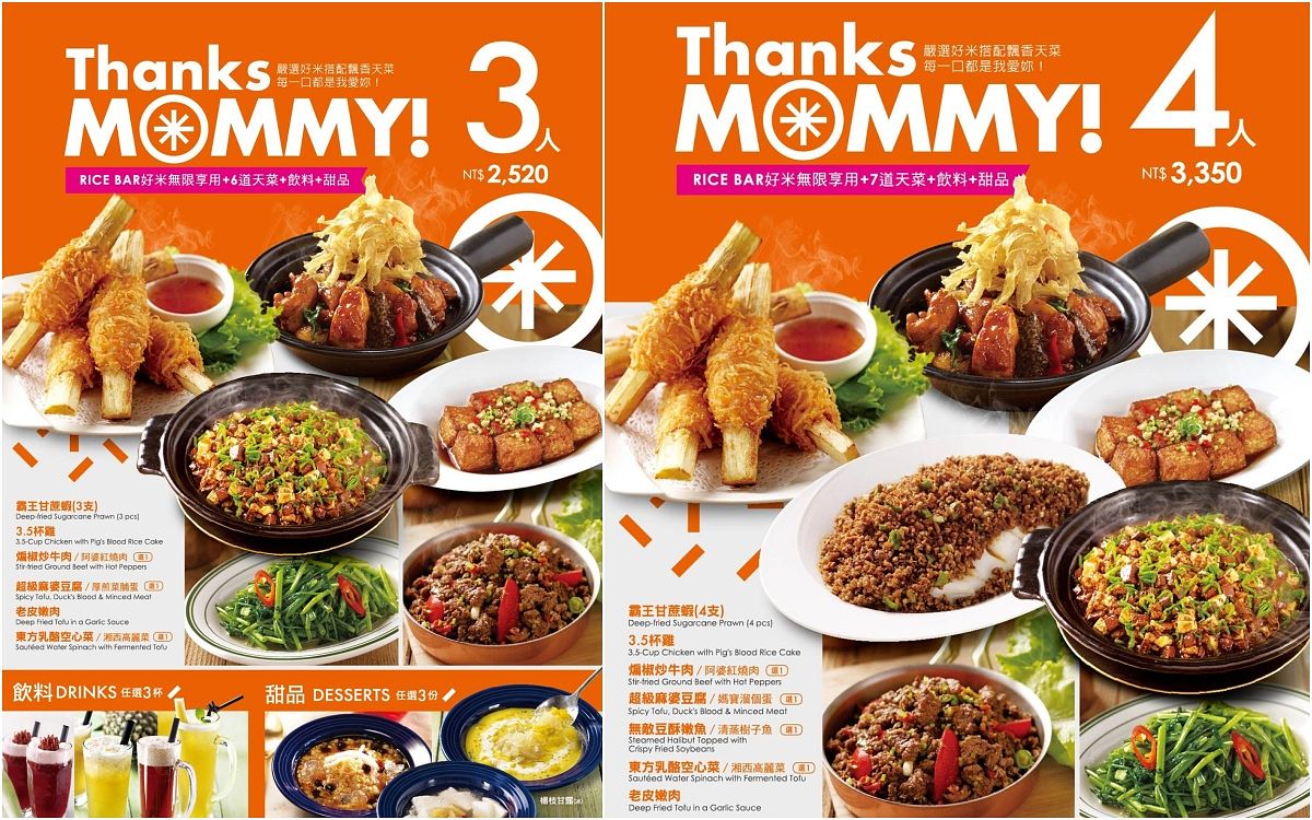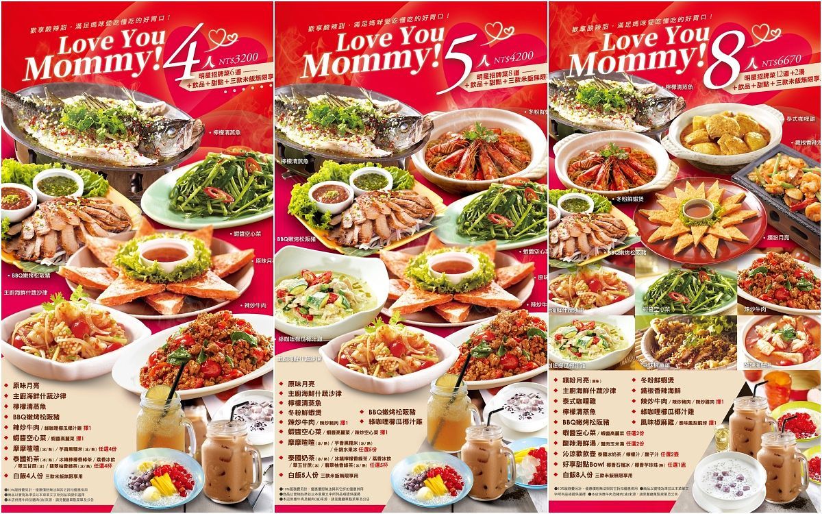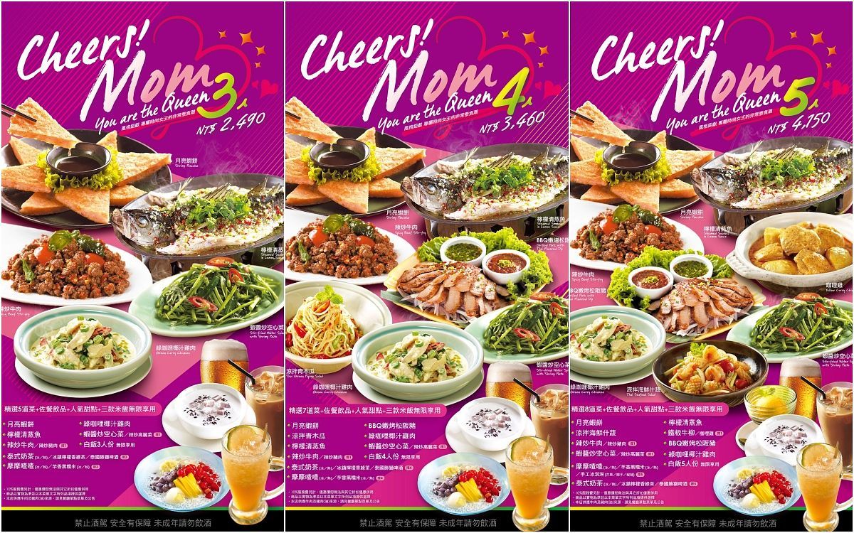 非常泰「母親節4人饗宴」包含獨創經典菜色,100%純蝦泥手工製作《月亮蝦餅》、非常泰必吃《涼拌青木瓜》、酸溜好滋味的《檸檬清蒸魚》、選用頂級厚切松阪豬的《BBQ嫩烤松阪豬》、香辣下飯的《辣炒牛肉》、女性票選最愛濃郁系《綠咖哩椰汁雞》、鹹香脆口的《蝦醬空心菜》及4人份甜點、飲料、米飯。
