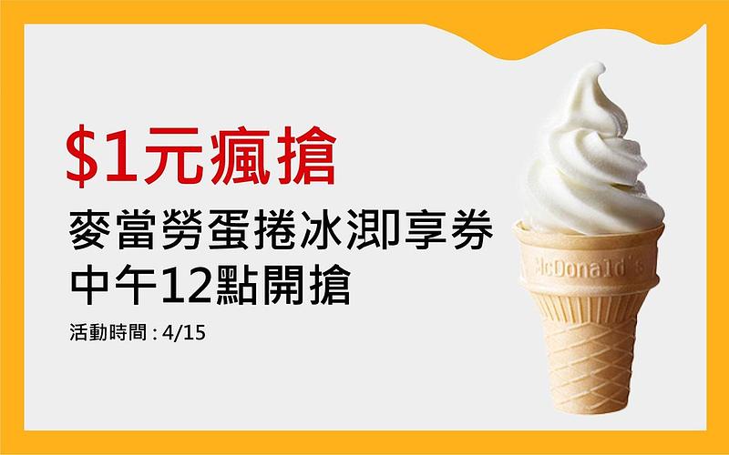 為讓大家用沁涼的心情迎接夏日,Klook推出夏特賣快閃【限量1元瘋搶麥當勞蛋捲冰淇淋】,只要下單速度夠快,就能用1塊錢買到原價18元的蛋捲冰淇淋!4月15日中午12點到Klook夏特賣活動頁面,點擊麥當勞蛋捲冰淇淋即享券商品圖卡,輸入指定優惠碼,就能用1元下單蛋捲冰淇淋,限量1,000支搶完為止!