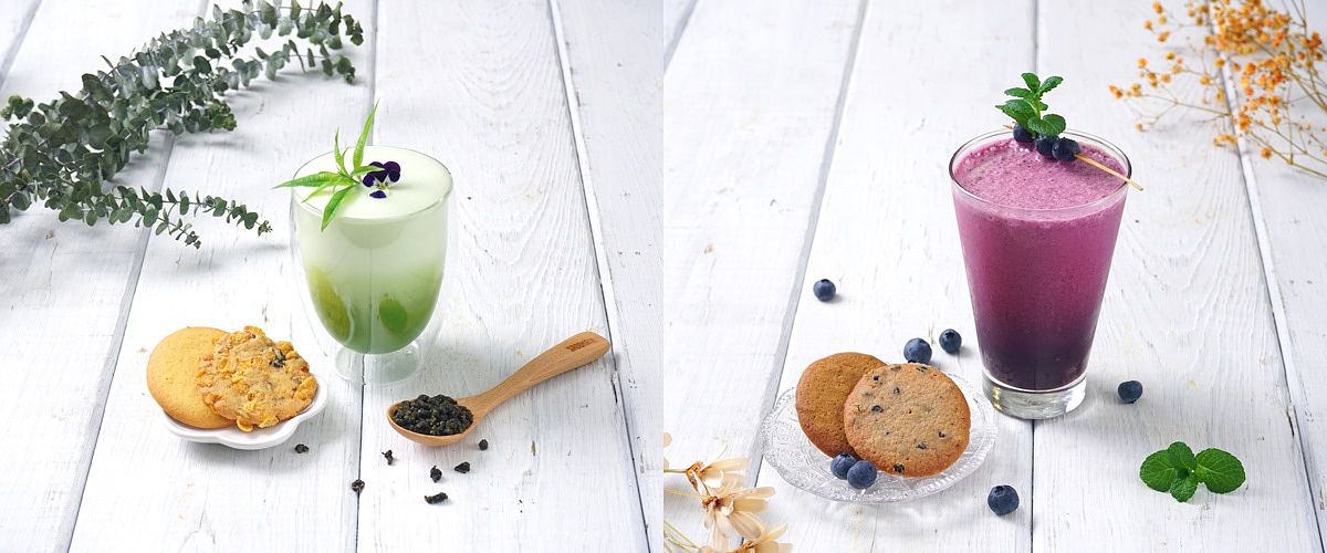 適合搭配手工餅乾的聯名特調飲—「春芽」(左)與「月下灌木」(右)