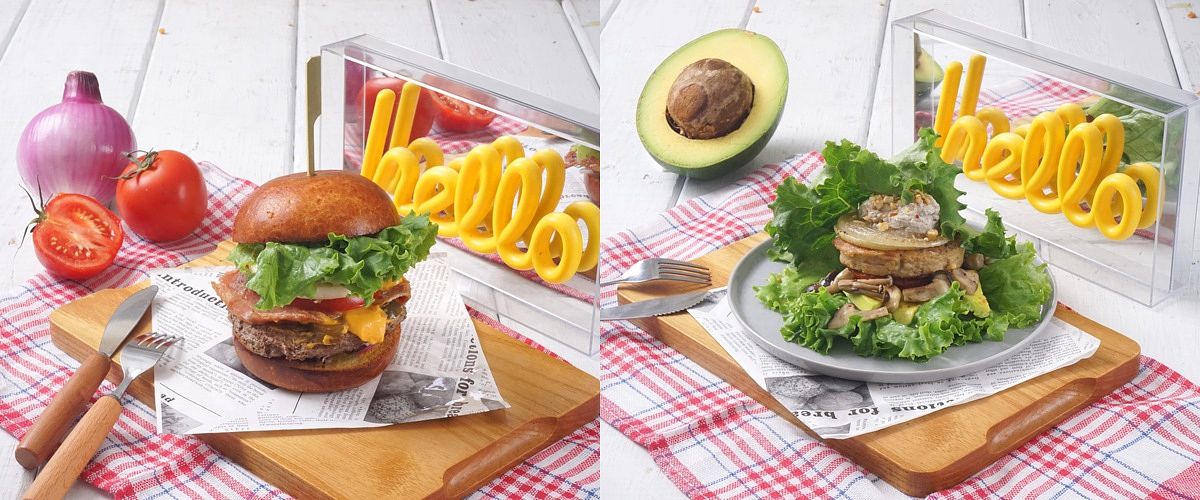 春季菜單主餐—「美式經典極肉漢堡」(左)與「私房蔬烤豆腐排漢堡」(右)