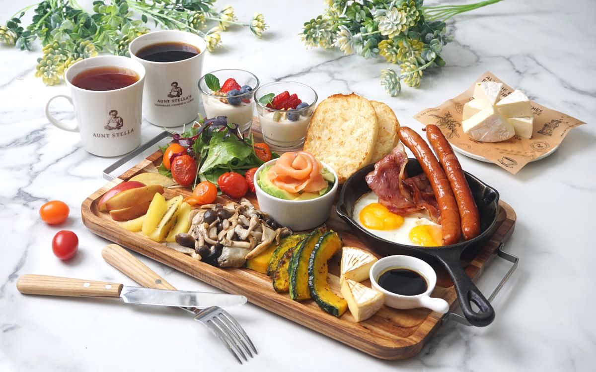 主打美式鄉村風的Aunt Stella咖啡廳首次推出「詩特莉經典大早餐」,可供二至三人共享之份量澎湃、且內容物豐盛,包含早午餐必備的煙燻培根、德式香腸、太陽蛋,並嚴選口感軟Q、入口即化的布里起司,推薦可與烤至酥香脆口的英式瑪芬一同品嚐;中央以玫瑰花瓣狀呈現的煙燻挪威鮭魚酪梨盅,不僅美味、更為此款新餐顏值大大加分;另佐以鮮果豆乳優格杯、綜合炒菇、香烤時蔬與沙拉等,解膩同時更符合營養訴求,為好友相聚共度悠閒時光的分食首選。同系列早午餐新品亦有「煙燻培根班尼迪克蛋瑪芬」與「挪威燻鮭魚佐酪梨班尼迪克蛋瑪芬」,淋上主廚秘製蔬菜荷蘭醬之開放式瑪芬搭配不同主食材肉品和鮮蔬,滋味鮮美更輕盈低負擔。