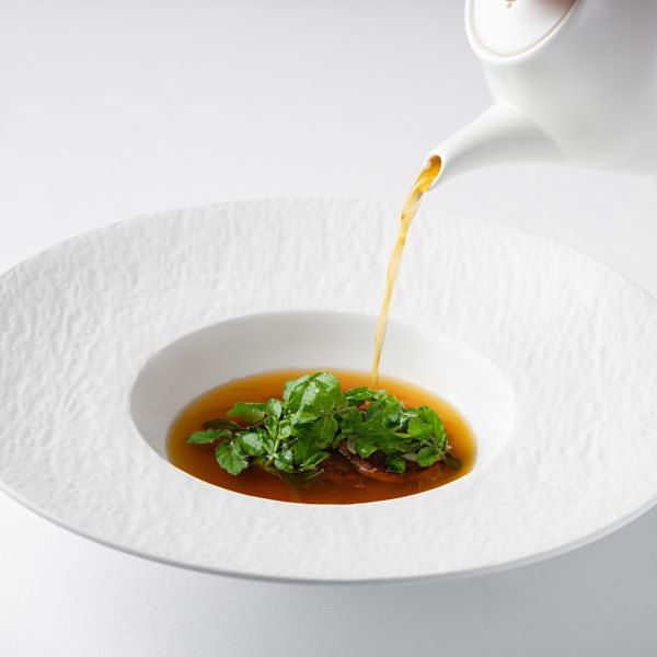 取自台南牛肉湯與法式清燉牛肉鍋為靈感,相異的文化,卻暢流著相同乾淨、純粹的清甜肉汁,以慢燉的牛舌為主體,加入川菜中不可或缺的花椒,提煉出富有前中後韻的湯品。