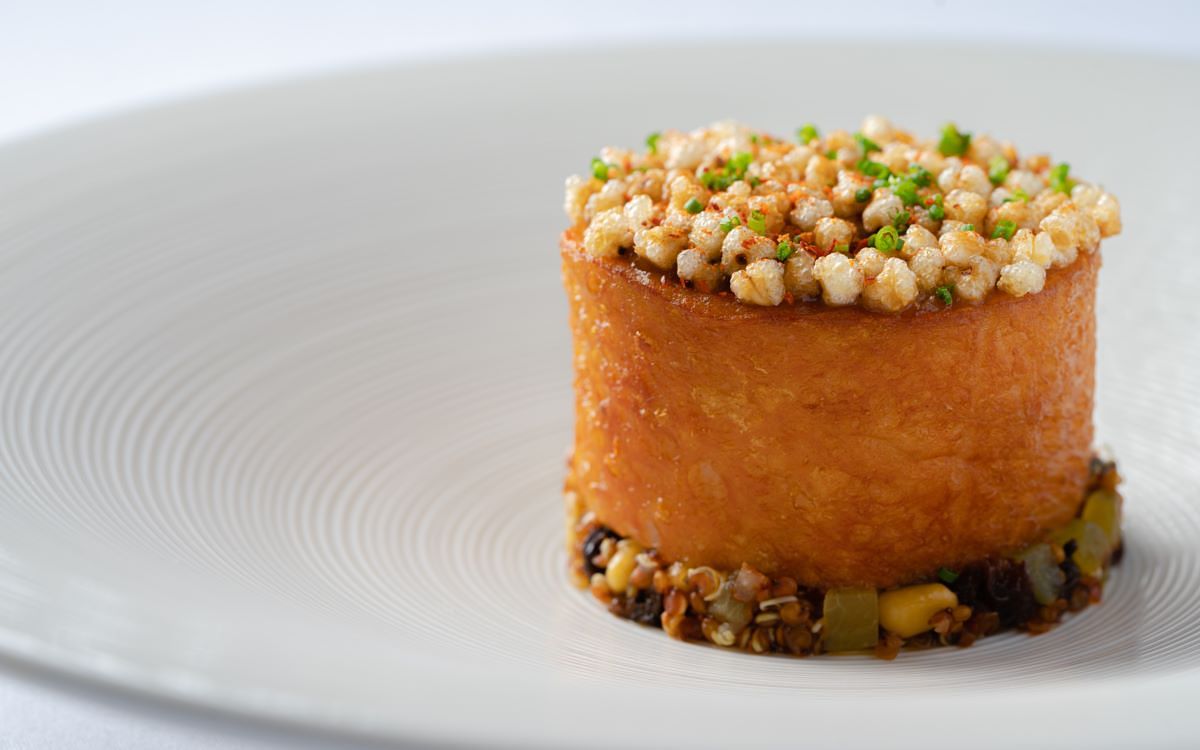 而CHA CHA THÉ Cuisine餐程上,視完整菜單為一趟具起、承、轉、合的旅程,缺一不可,從晚間套餐中清爽飽滿開場的「藍蟹肉/絲綢乳酪/柚子」,以需半個工作天烘烤的香澄作為容器基底,點綴著柚香晶凍,充分體現出果實結出的朝氣;大器溫潤的「慢燉牛舌湯」,在琥珀色花椒澄清牛湯的引領下,帶出純粹清甜的肉汁,後循出富有前中後韻、回甘的花椒澄清牛湯香氣。