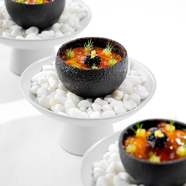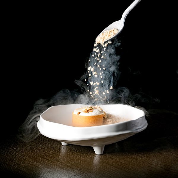 動人的外觀,為需烘烤半個工作天的香橙殼,作為此料理的餐盤,以內乘載著絲綢乳酪、參半著印度洋藍蟹肉為靈魂,鋪蓋上春日清香的柚香晶凍作為飽滿濃郁口感中,最畫龍點睛的一筆。