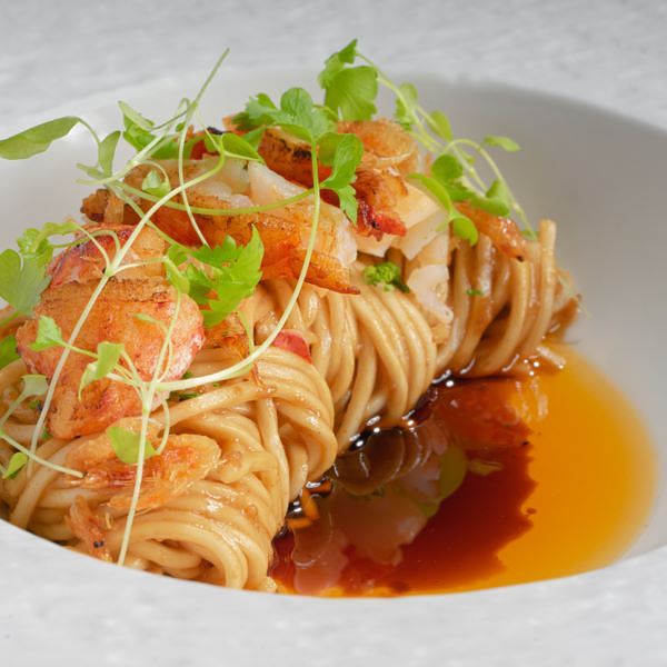 保留第一季菜單中高度好評的法式龍蝦醬搭配手工麵,大量波士頓龍蝦頭熬煮而成的醬汁,加入特殊辣油和甘甜醬油,讓人不禁憶起中華料理的美好,搭配飽滿的龍蝦肉與酥炸過的櫻花蝦,使整道料理貫穿著最密不可分的中西結合。