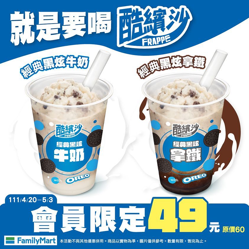 全家便利商店酷繽沙系列「經典黑炫拿鐵」新登場!以OREO餅乾融入綿密冰沙搭配咖啡,巧克力與咖啡香完美融合!此款與喝得到巧克力碎片的經典口味「經典黑炫牛奶」,即日起至5/3推出會員嚐鮮優惠49元。