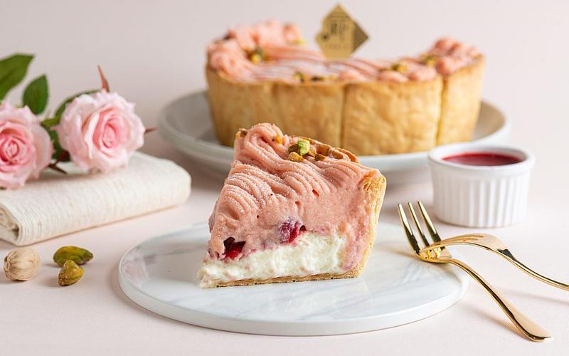 以嚴選的奶油起司和蛋白烘焙的經典原味起司塔做為內餡基底,口感綿密滑順,鋪上清新的綜合莓果果凍,再擠上以粉色優美線條交織而成草莓卡士達鮮奶油,最後以開心果點綴。「開心莓好起司塔」層次豐富多變,味道揉合出酸甜醇厚滋味,經比例調和為尾韻帶來莓果獨特的清甜香氣,適當甜度和著一絲果酸,讓歡度母親節饗宴的飯後甜品,是一個清爽開味無負擔的節奏!