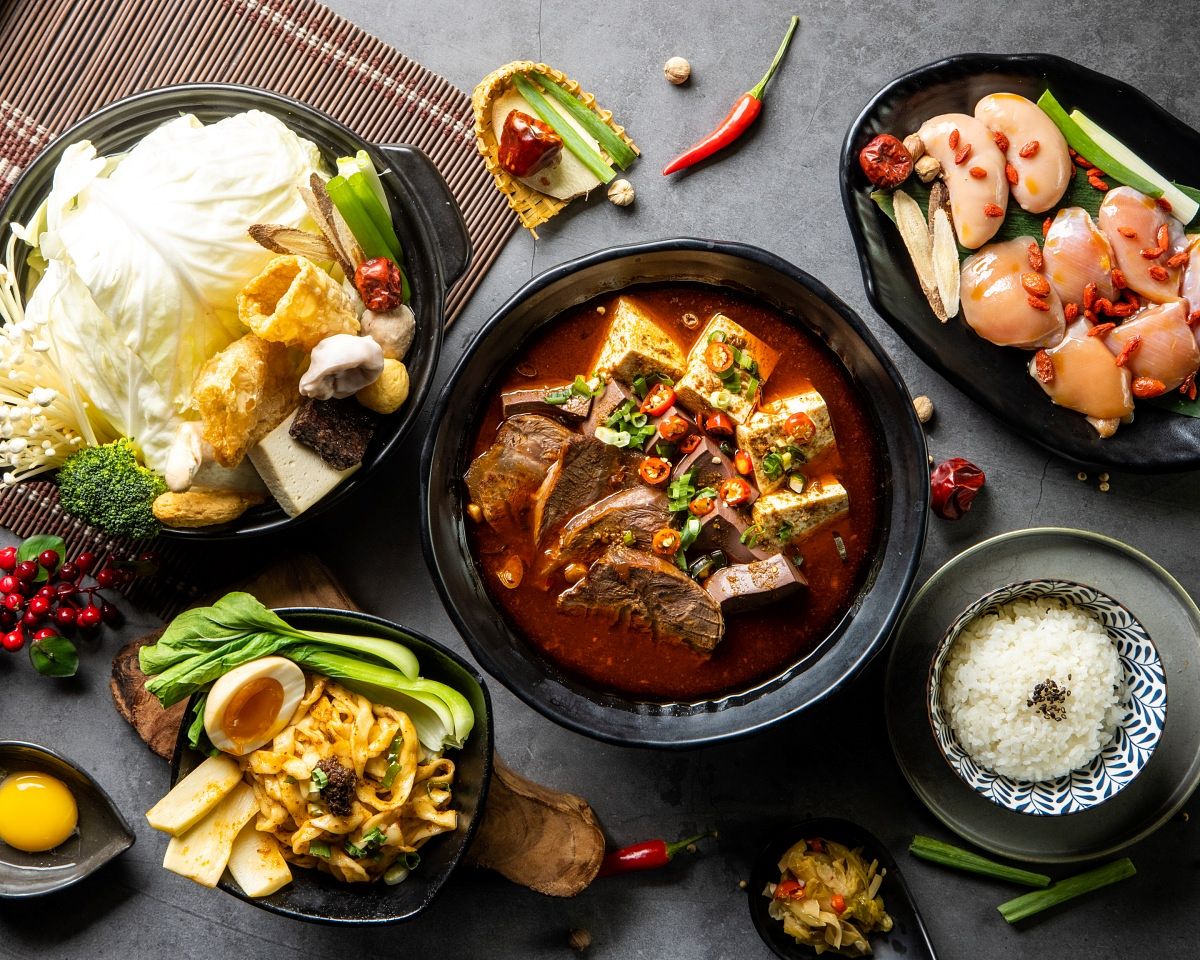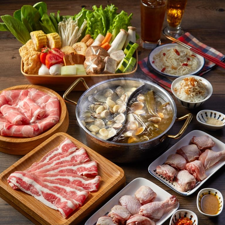 尬鍋台式潮鍋「四人尬鍋分享餐」任選雙拼湯頭三款肉,慢火細熬的剝皮辣椒、金銀蒜頭、酒香麻油湯底,加上一鍋雙饗雙肉大飽足。