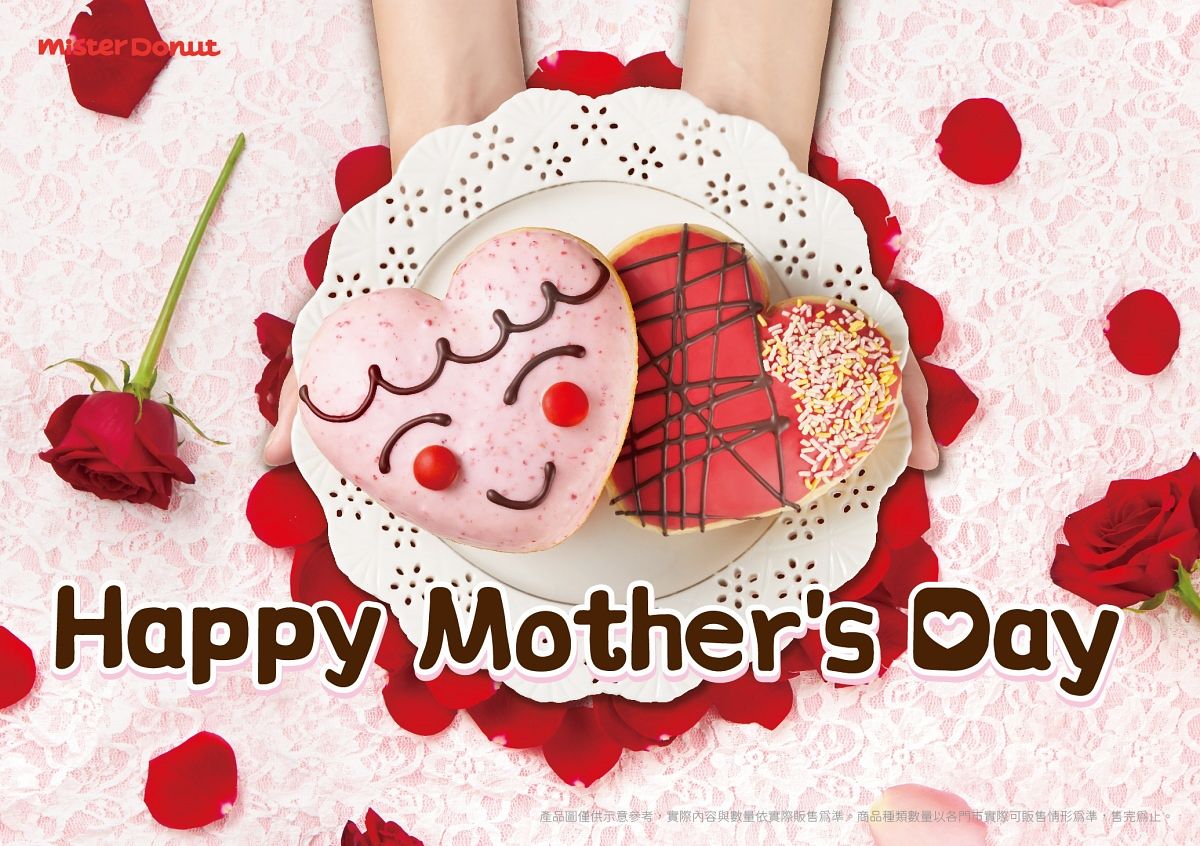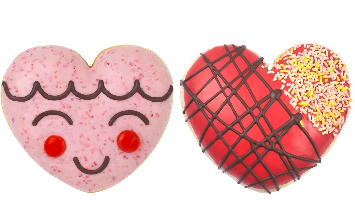 Mister Donut以擬人化的微笑和典雅線條創作出兩款粉嫩的愛心造型甜甜圈,使用酵母甜甜圈為基底,搭配清爽不膩的內餡與香甜水果可可沾醬,「雙莓愛心」外層為香甜草莓可可醬,象徵粉嫩的臉蛋。再以可可醬點綴腮紅與微笑,內餡為酸甜帶顆粒咬感的藍莓鮮奶油。「天使蘋果甜心」外層為香甜蘋果可可醬,以可可醬畫上典雅線條和繽紛水果巧克力米點綴,搭配滑順鮮奶油內餡。
