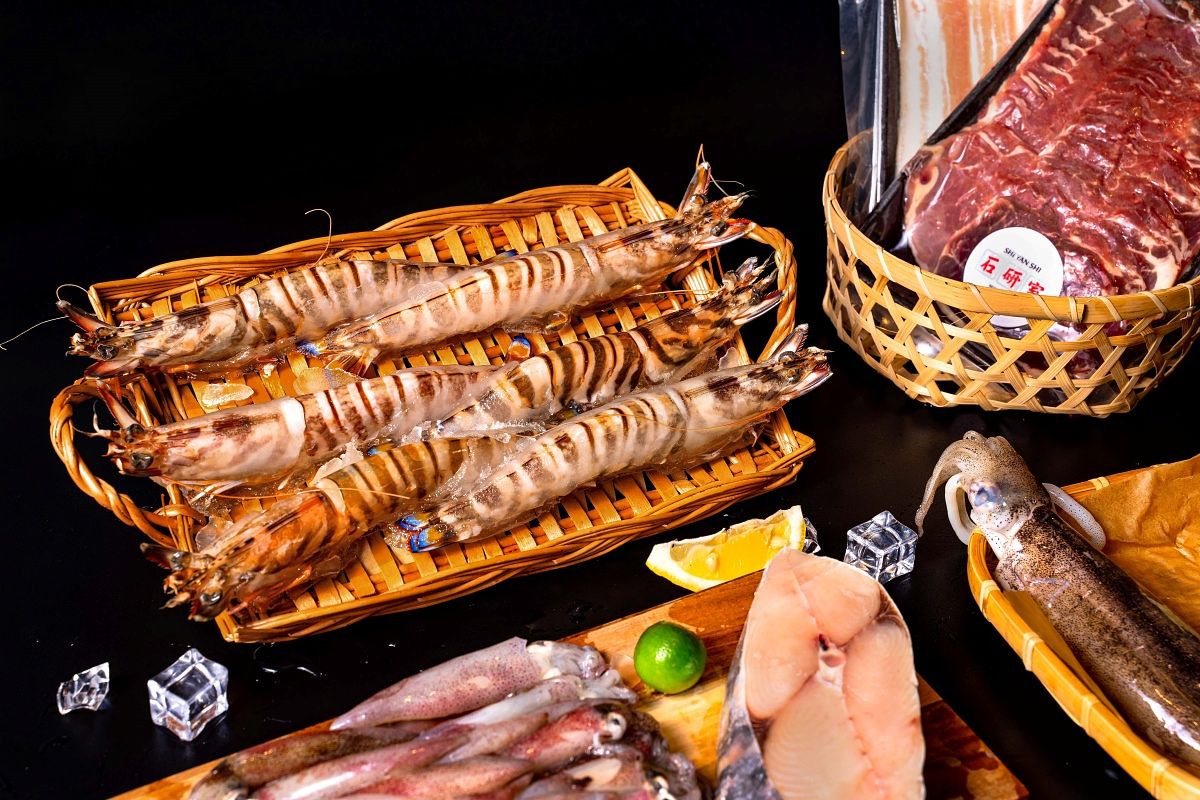 「甘蝦媽咪明蝦生鮮組」精選頂級野生大明蝦,經活凍處理後鎖住新鮮海味,超過一個手掌大的明蝦,口感鮮甜脆彈、蝦膏豐富,搭配澎湖軟絲、土魠魚、小卷、鮑魚、豬五花、牛板腱及甘蔗昆布高湯,一次就能享用到多款海陸美味。