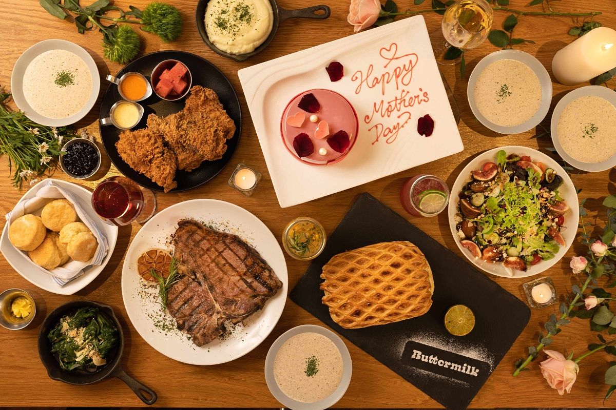 主廚以「香烤鮭魚威靈頓」為大餐主角,套餐內容還有原木燒烤美國安格斯T-骨牛排18oz、Buttermilk餐廳最受歡迎的美國阿嬤秘方炸雞以及多道配菜、沙拉、飲品,另外再附贈母親節「莓麗佳人」慕斯蛋糕」。