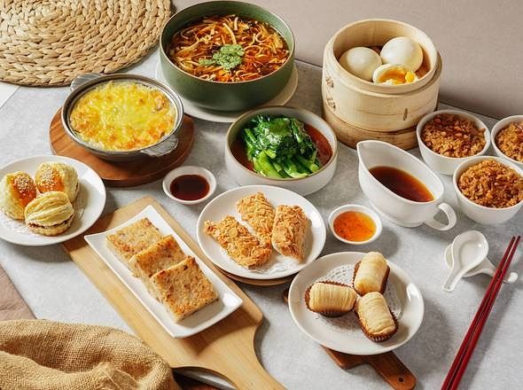 以獨特蔬食港式飲茶聞名的「養心茶樓」,推出「人氣港點組」NT.1398,包含蘿蔔絲酥餅、西杏山藥捲、鬆化叉燒酥、香煎蘿蔔糕、芝士焗白菜、黃金流沙包、蠔油芥蘭、酸辣金絲羹及牛蒡飯。