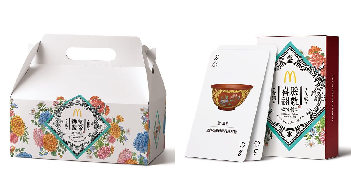 十八世紀的西方世界,正值啟蒙思潮風起雲湧的年代,清朝皇帝也因受傳教士影響了皇家作坊的生產與創作,縱跨康雍乾三朝的「畫琺瑯工藝」即是其中一項,更將「琺瑯彩瓷」作為御製風格食器;此次台灣麥當勞攜手故宮精品聯名合作,便是以此為靈感,將皇帝御製琺瑯彩瓷上的花彩繪上「麥當勞分享盒」,百花景簇的意象優雅的綻放盒面,搭配「皇帝御製」四字款識,透過古今東西合壁的美器相配,增添美食滋味。