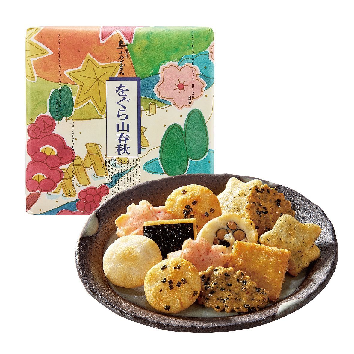 以米菓表現日本四季的「小倉山春秋」是小倉山莊的代表性產品。每袋裝有8種小米菓,包裝是充滿高級感的日式圖案設計。