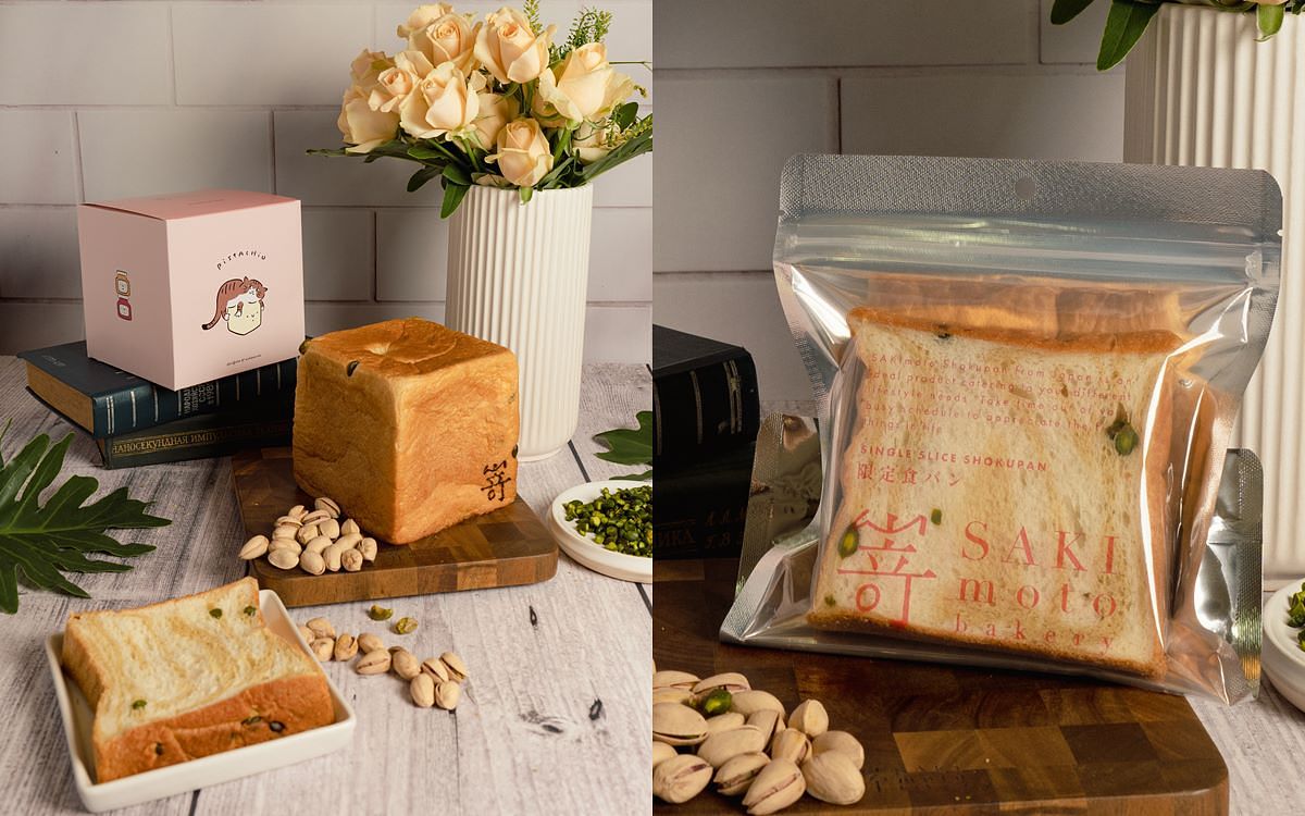 色調精緻、口感鬆軟的開心果生吐司,使用最頂級嵜本小麥粉,加上北海道產牛奶所製成的經典款極生麵糰,與開心果麵團相互揉合,製出令人驚豔的白綠相間大理石波紋 ; 麵糰以湯種麵糰去攪拌,並以 SAKImoto 慣用的直接製法製作,在攪拌過程中一邊加入開心果果醬與果粒 - 當一口咬下,烘烤過的開心果醇香,油脂感豐厚,風味迷人,內餡運用來自義大利進口的阿葛麗蒙塔娜開心果醬、100%產自義大利的開心果研磨而成,因無添加人工色素,色調上呈現自然蓬鬆的淺黃綠松花色,香氣芬芳,無論在口感或視覺上,都富有層次、回味悠長。若想變化不同風味,搭配柔潤的奶油、巧克力果醬與莓果果醬,能帶來更豐富的層次感,單吃、烤來吃、搭抹醬都有不同程度的享受,適合這個五月,獻給偉大的媽媽們。