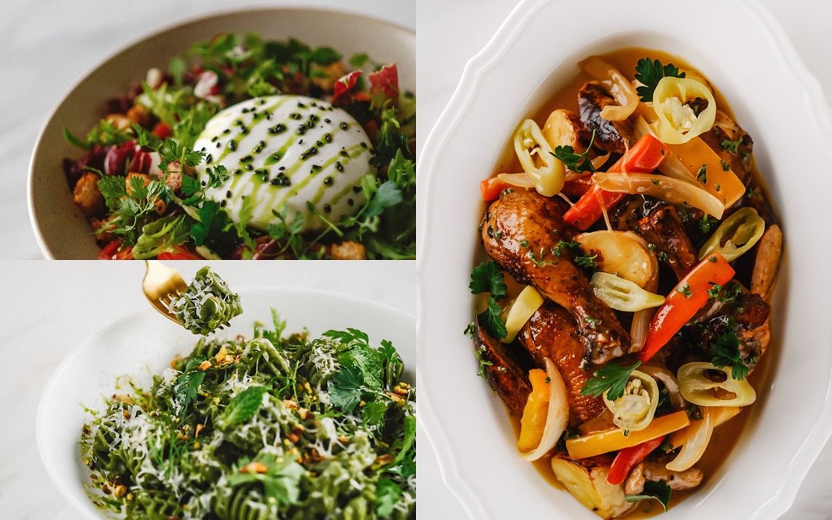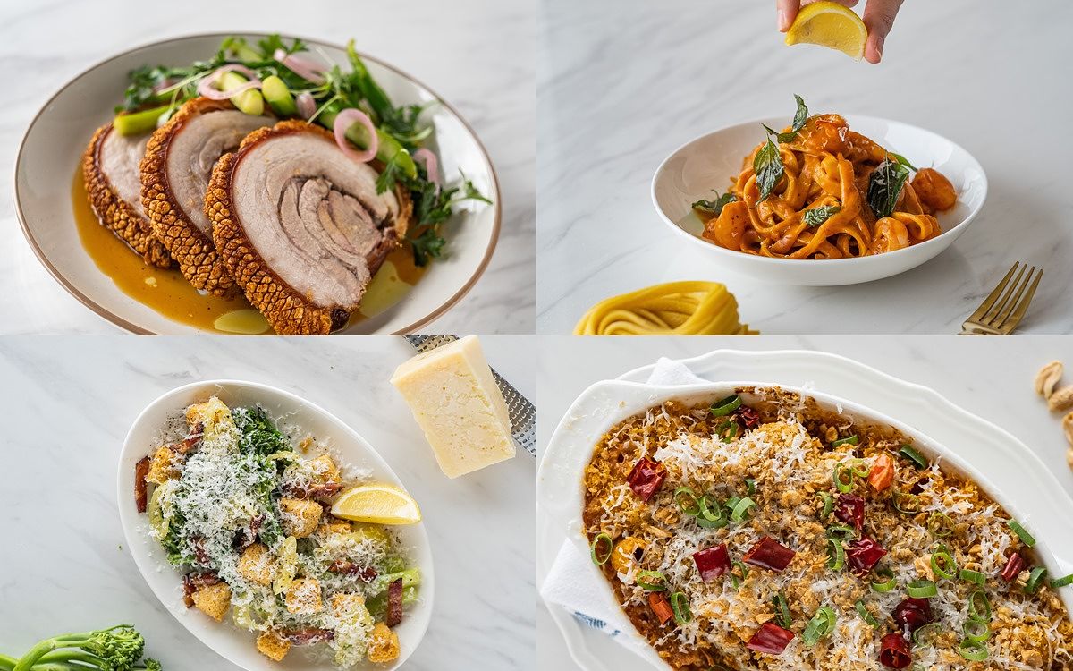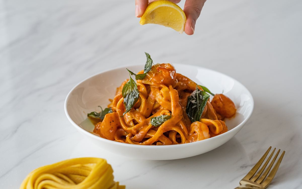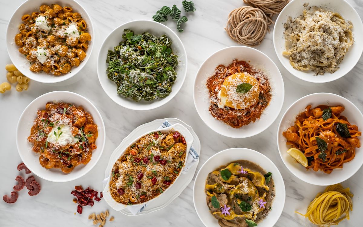 主廚由自己愛吃的宮保雞丁發想,「焗烤宮保彎管麵」融合花椒麵包粉、香脆辣椒、烤花生、蒜酥等”宮保”元素,呈現麻香酸辣川菜滋味;「雞肉鴨肝慕斯餃」將美國常見家常菜瑪沙拉雞肉解構,自製麵餃包入雞肉慕斯及鴨肝,襯以義大利瑪沙拉酒及乾香菇烹製醬汁,洋溢果香與蕈菇濃郁香氣;以酸種麵包概念發酵麵糰製成的「酸種番茄麵」,佐一整顆炸至金黃的布拉塔起司,為經典番茄義大利麵注入新意;大量蝦高湯與香草造就鮮味十足的「鮮蝦番紅花鳥巢麵」,地中海辣甜椒醬增添微酸香燻辣亮點;「煙燻南瓜臘腸水管麵」水管麵帶有枸杞亮橘與幽香,墨西哥煙燻辣椒、義大利卡拉布里臘腸的燻辣鹹香搭佐酸奶完美平衡;「開心果青醬蜂巢麵」以菠菜及有機螺旋藻粉賦予蜂巢麵天然翠綠,青醬融合開心果、羅勒、蒜頭、起司濃郁飽滿香氣,拌入焦化奶油百里香油醋及香草、堅果,多層次風味層層堆疊;「松露奶油吸管麵」以經典奶油胡椒口味義大利麵融入黑松露醬與白松露油增添濃郁馨香,吸管麵沾附濃醬,佐現刨新鮮黑松露,香氣滿盈口感絕佳;「番茄奶油雞冠麵」番茄紅雞冠麵與酸香濃郁番茄奶油醬、風乾番茄的濃縮果香、及絲綢起司柔滑奶香帶給味蕾清新體驗。