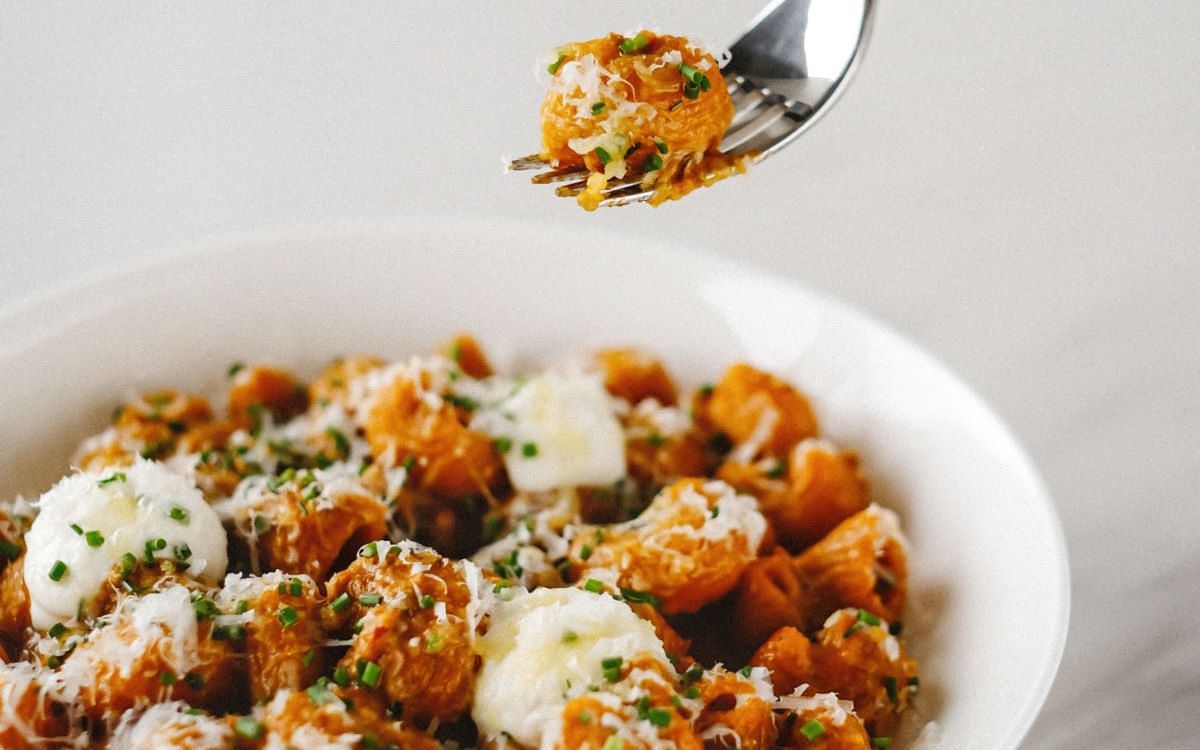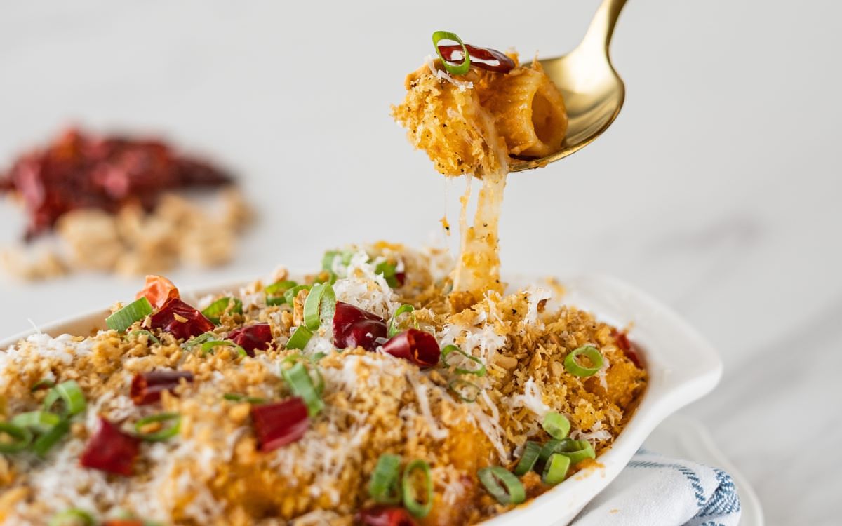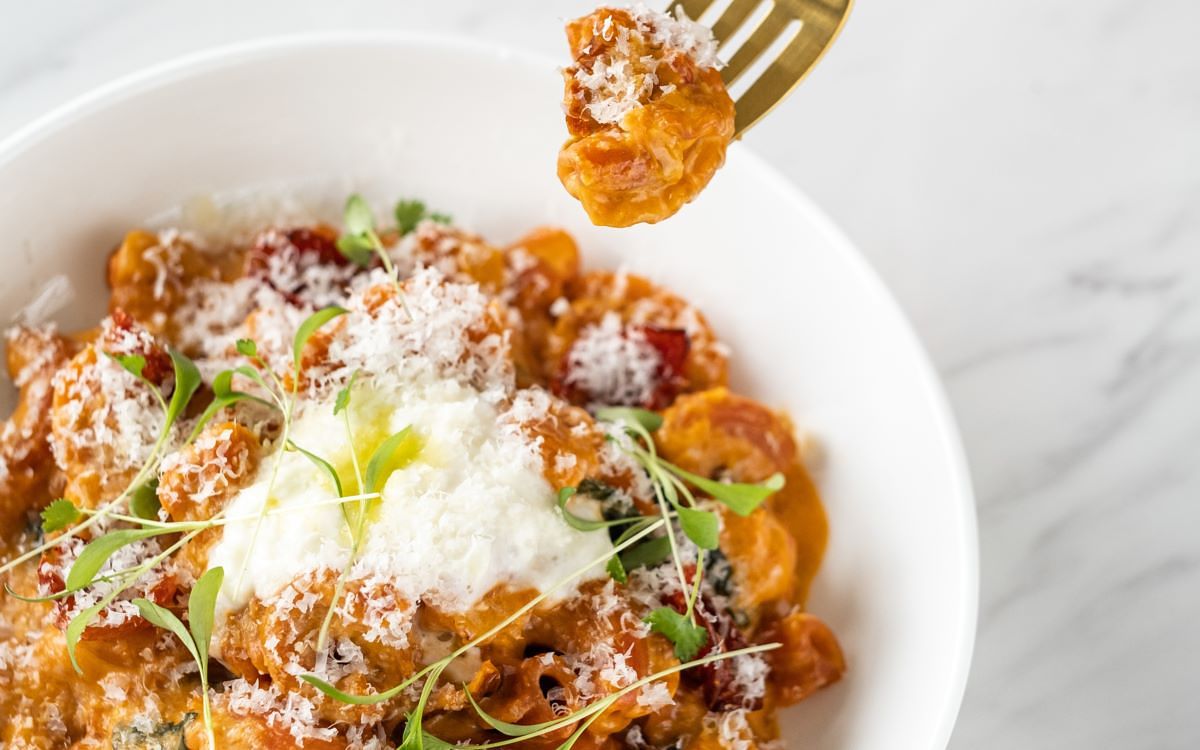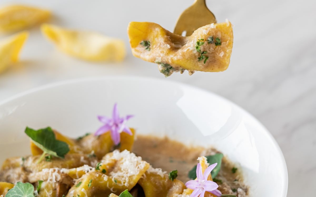 主廚由自己愛吃的宮保雞丁發想,「焗烤宮保彎管麵」融合花椒麵包粉、香脆辣椒、烤花生、蒜酥等”宮保”元素,呈現麻香酸辣川菜滋味;「雞肉鴨肝慕斯餃」將美國常見家常菜瑪沙拉雞肉解構,自製麵餃包入雞肉慕斯及鴨肝,襯以義大利瑪沙拉酒及乾香菇烹製醬汁,洋溢果香與蕈菇濃郁香氣;以酸種麵包概念發酵麵糰製成的「酸種番茄麵」,佐一整顆炸至金黃的布拉塔起司,為經典番茄義大利麵注入新意;大量蝦高湯與香草造就鮮味十足的「鮮蝦番紅花鳥巢麵」,地中海辣甜椒醬增添微酸香燻辣亮點;「煙燻南瓜臘腸水管麵」水管麵帶有枸杞亮橘與幽香,墨西哥煙燻辣椒、義大利卡拉布里臘腸的燻辣鹹香搭佐酸奶完美平衡;「開心果青醬蜂巢麵」以菠菜及有機螺旋藻粉賦予蜂巢麵天然翠綠,青醬融合開心果、羅勒、蒜頭、起司濃郁飽滿香氣,拌入焦化奶油百里香油醋及香草、堅果,多層次風味層層堆疊;「松露奶油吸管麵」以經典奶油胡椒口味義大利麵融入黑松露醬與白松露油增添濃郁馨香,吸管麵沾附濃醬,佐現刨新鮮黑松露,香氣滿盈口感絕佳;「番茄奶油雞冠麵」番茄紅雞冠麵與酸香濃郁番茄奶油醬、風乾番茄的濃縮果香、及絲綢起司柔滑奶香帶給味蕾清新體驗。
