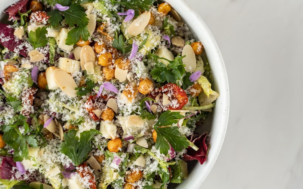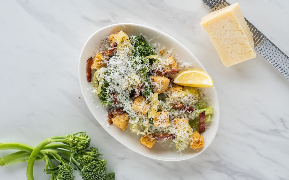 青花筍凱薩溫沙拉、醃香蕉辣椒、焦糖培根&麵包丁 NT 350