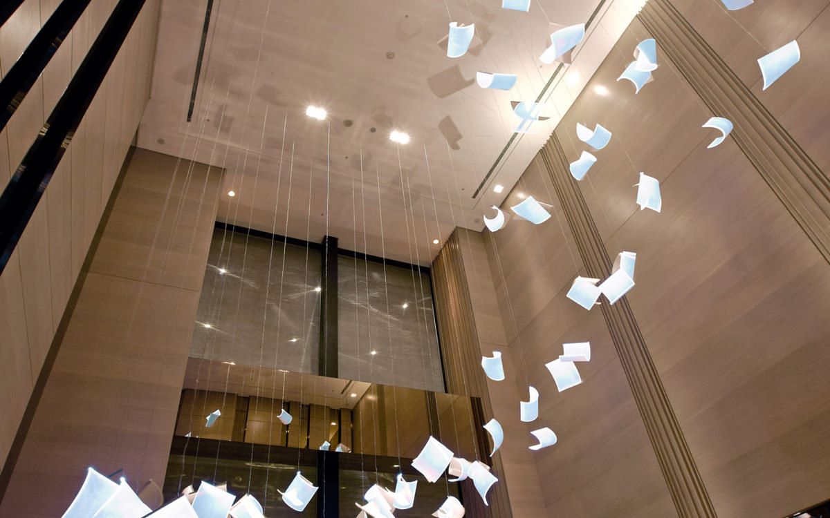 首先,位處於酒店一樓迎賓入口處、猶如紙片躍舞於空中的《狂風驟起》(Bourrasque)導電發光板裝置藝術,為英國藝術家保羅.考克斯基(Paul Cocksedge)的知名作品,2011年首次於法國里昂市議會展示,隨即引起熱烈關注,寒舍艾麗於2013年開幕時特別委託考克斯基針對一樓空間量身訂製艾麗版的《狂風驟起》,並成為其全球第一件常設性展示的裝置作品,爾後台南市立圖書館總館及法國時尚精品DIOR巴黎蒙田總店亦能看見同系列作品的蹤跡。
