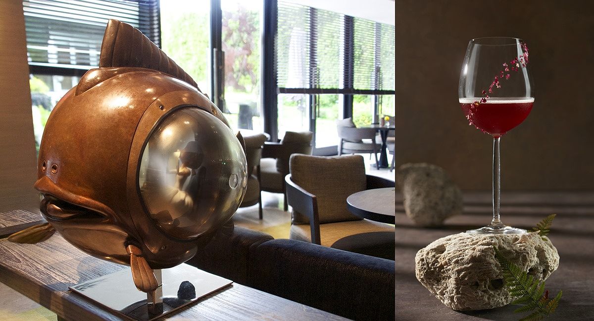 矗立於六樓戶外花園的以色列裔藝術家薩多.彬.大衛(Zadok Ben-David)的耐候鋼雕塑作品《自然之塔》(Nature Tower),展現一群被賦予蝴蝶翅膀的舞者翩翩起舞的交疊姿態。美麗蝴蝶蘋果片停駐於杯口的「自然之塔」同名調酒,調酒師特以「蝴蝶飛舞於溪川」為主題進行發想,揉合多重繁複技法特調而成。印入眼簾,輕刷於杯身的那抹嫣紅,象徵耐候鋼隨著時間氣候演變的鏽銅色澤。嚐起來十分清爽的金黃透亮酒液,先將番茄以澄清手法萃取出透明汁液,再與雪莉酒進行勾兌調製而成,表達溪邊魚蝦的鮮味。同時將生長於溪邊的野薑花與苦艾酒一起進行舒肥(sous vide),帶入花香調性。位上呈獻給賓客時,再輕輕滴入表徵石頭青苔的藻類橄欖油,增添口感上的包覆感,彷彿漫步於河川邊旁,感驗潺潺溪水與岩石礦物的大自然氛圍。