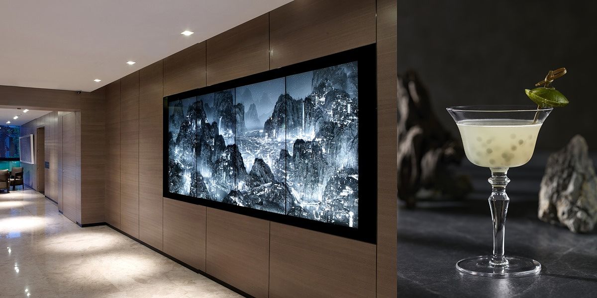 位於另一側客房樓層電梯前方牆面的《極夜之晝》(The Day of Perpetual Night)9分鐘黑白錄像視頻,遠看為黑白山水墨畫,近看實為都會夜景,為中國攝影藝術家楊泳梁的作品。調酒師玩心大發運用多重對比呈現「極夜之晝」同名調酒。首先為色彩對比,以Tanqueray琴酒、澄清手法萃取的番茄水、馬丁尼白香艾酒等調和成透白酒液,佐搭黑色漂浮高粱晶球,彰顯作品的黑白光亮感。其次為口感對比,在柔滑酒液中感受晶球於舌尖流竄的絕妙滋味!以及東西對比,以濃厚東方味的高粱酒大膽表現西式調酒,輕咬晶球,濃烈酒韻蔓延齒間。調酒師更以似幽浮的馬丁尼杯與幽浮造型檸檬裝飾,精采刻畫作品最後15秒的幽浮畫面。
